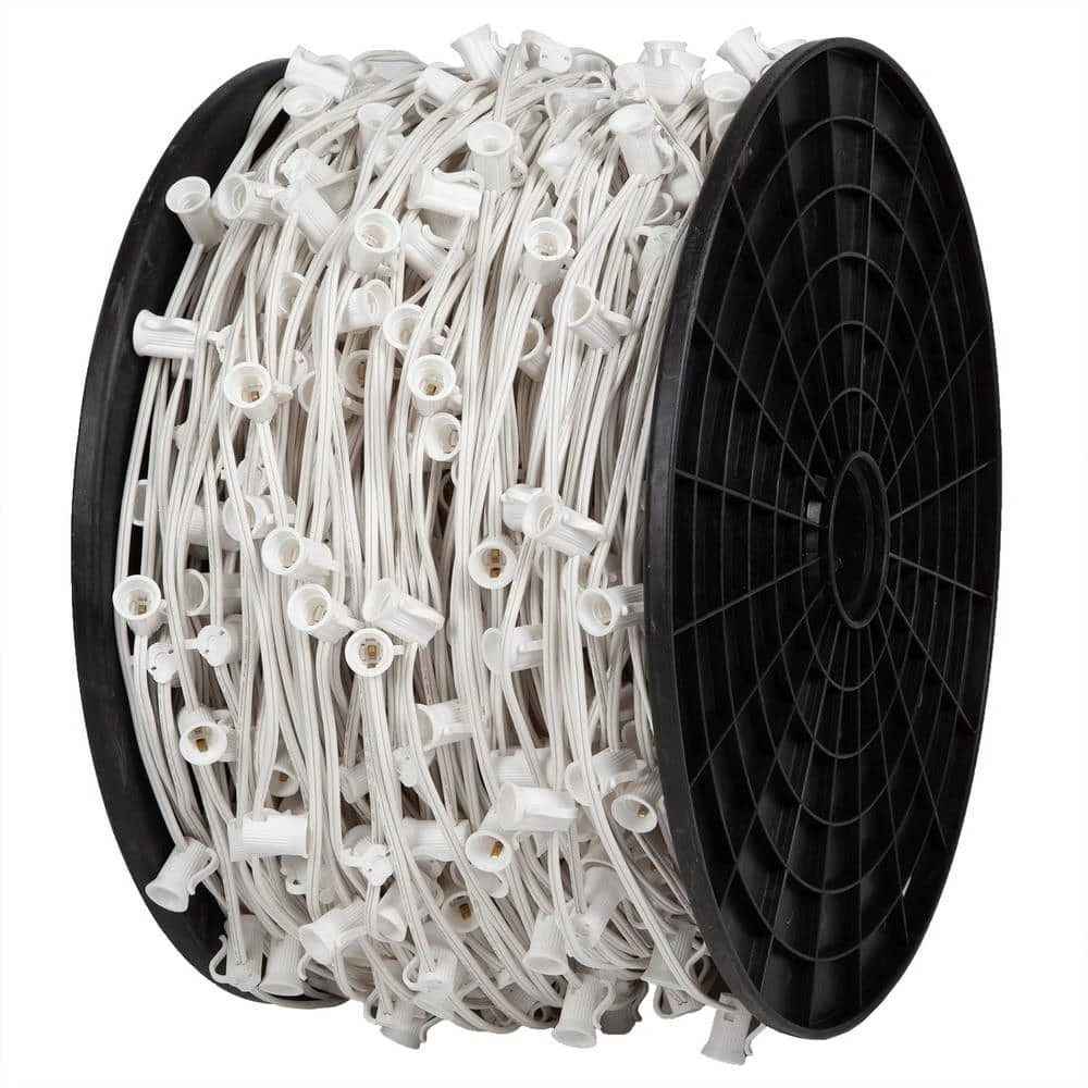 - 1,000 ft. C7/E12 white wire socket stringer spool with 12 in. spacing between 1,000 sockets, 12 in. lead
