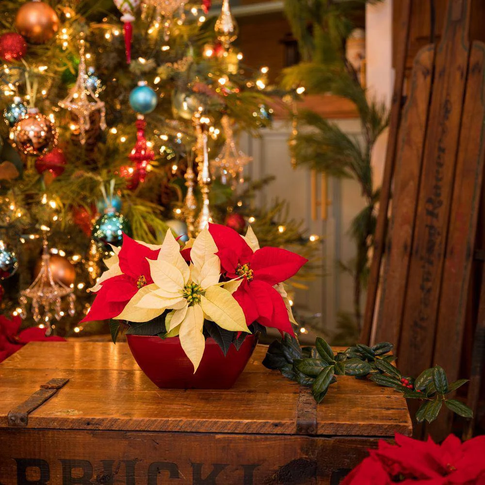 Decorate for the holidays with this 1-gallon red and white poinsettia mix from Metrolina Greenhouses. This Carina color bowl comes finished and ready to place in your home to create the look and feel of the holidays. Poinsettias, also known as Mexican Flameleaf, are the most popular holiday plant. They prefer bright, indirect light. Water your poinsettia when the soil is dry, being careful not to let the plant sit in water.