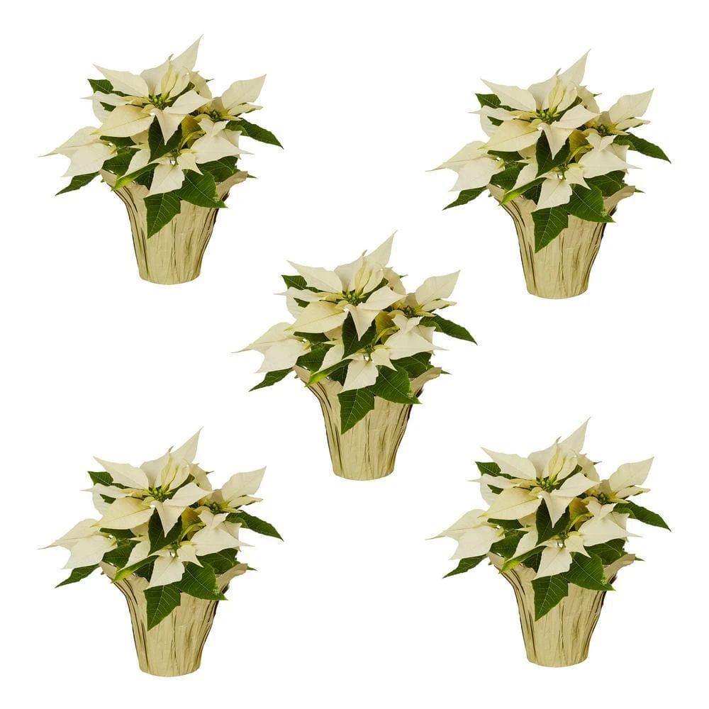 Decorate for the holidays with this 1 Qt. White Poinsettia 5-pack grown by METROLINA GREENHOUSES. These poinsettias come complete and ready to use in a decorative foil wrap anywhere in your home for holiday decorating. This multi-pack is perfect for giving gifts to your favorite teachers, nurses, neighbors or anyone else on your holiday list! Poinsettias, also known as Mexican Flameleaf, are the most popular holiday plant. They prefer bright, indirect light. Water your poinsettia when the soil is dry, being careful not to let the plant sit in water.
