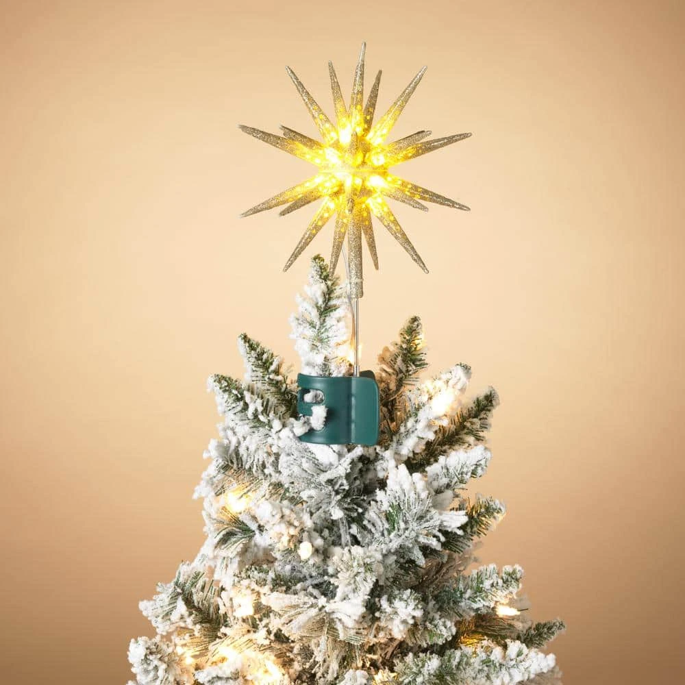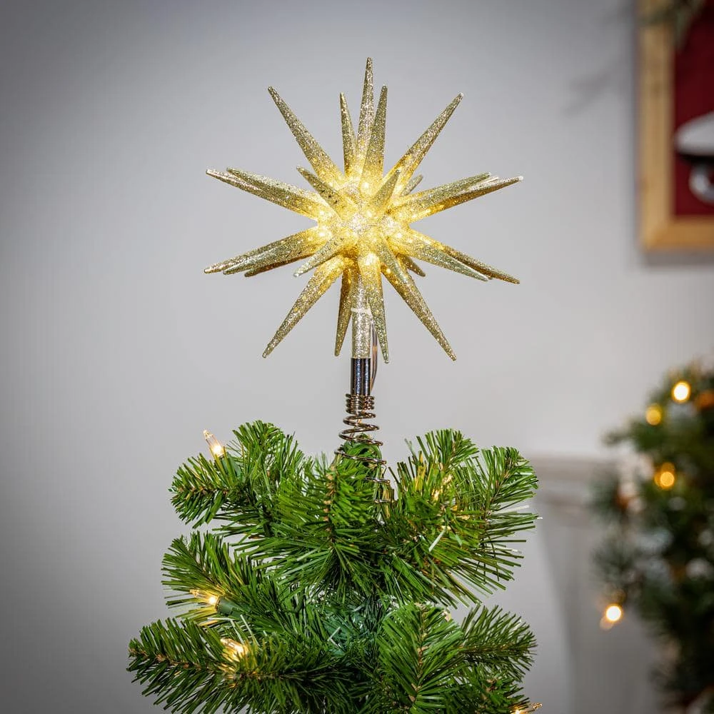 Light up the top of your tree with this beautiful electric starburst tree topper. It’s easy to place on any tree with its clip-on attachment and 24 in. L lead cord. At 10.36 in. H x 8.13 in. Dia it will make a statement on your tree this Christmas. For indoor use only, the topper uses an energy efficient LED light to brighten your tree.