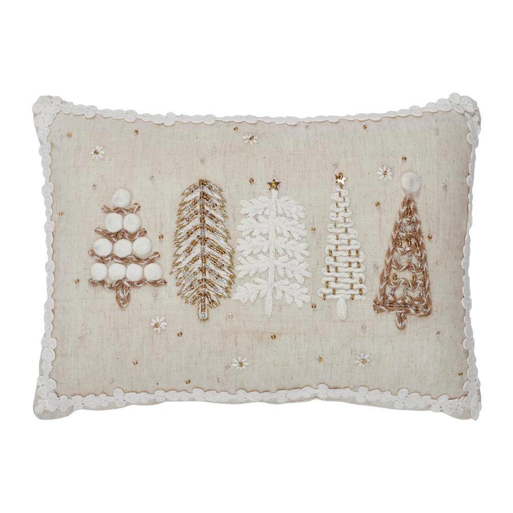 Introducing the VHC Brands 5 Christmas Trees White Pillow, a charming addition to your Winter and holiday decor. Crafted from cotton, this decorative throw pillow offers both durability and a soft, comforting texture, perfect for adding a touch of festive charm to your home. Measuring 14 in. x 10 in., its rectangular shape provides the ideal size for accenting your bed, entryway bench or living room sofa with seasonal flair. Embrace the spirit of Christmas with the stylish print of 5 Christmas trees adorned with bead trim, elegantly displayed on the white pillow. The light creme, bright white and gold hues evoke the festive ambiance of the holiday season, creating a warm and inviting atmosphere in any room. Whether placed in your bedroom, entryway or living room, this 5 Christmas Trees White Pillow adds a touch of farmhouse-inspired charm to your holiday decor. Designed for both style and convenience, this pillow is spot clean only, ensuring easy care and maintenance while preserving its vibrant colors and intricate embroidered detail. Whether you’re snuggling up with loved ones or hosting holiday gatherings, the VHC Brands 5 Christmas Trees White Pillow brings a sense of warmth and joy to your seasonal decor. Embrace the spirit of the season with this delightful throw pillow that celebrates the timeless beauty of Christmas trees and the magic of the holiday season.