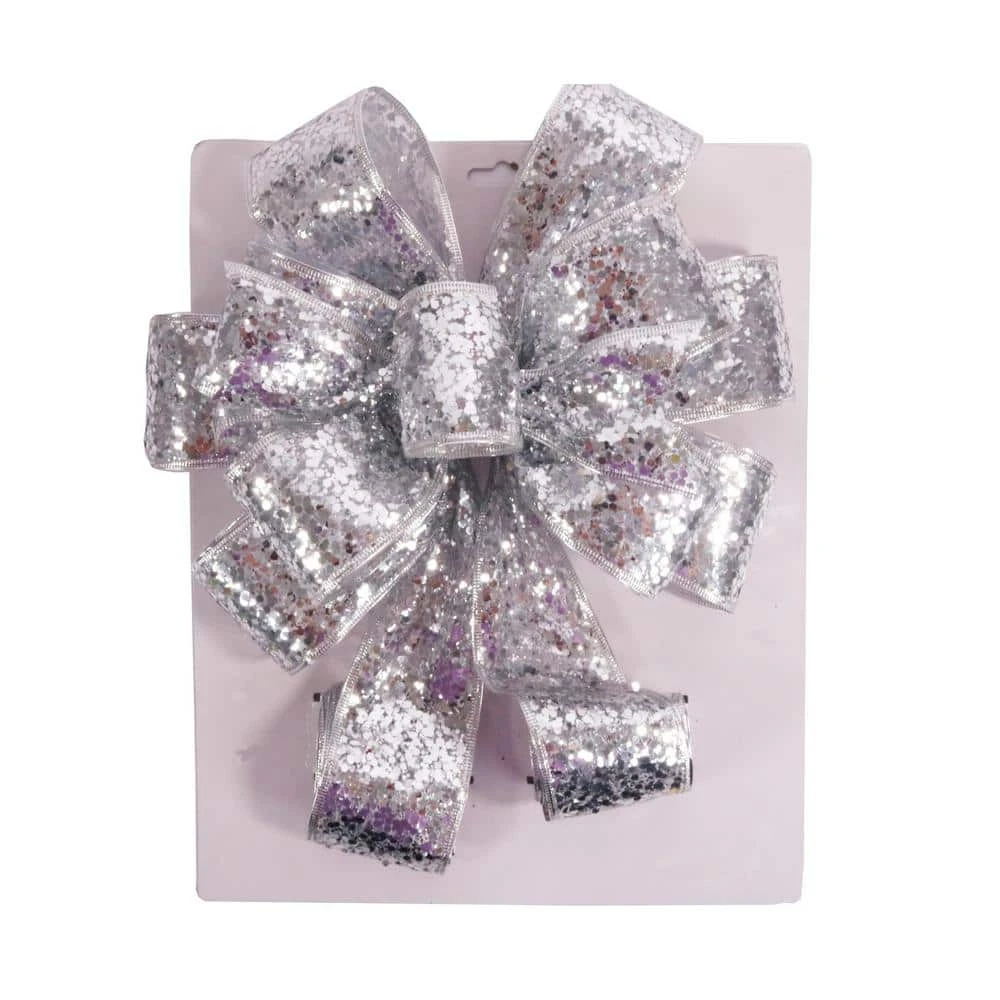 Santaland Sparkle burlap tree topper bow. Decorate your tree or home with the beautiful Christmas bow. 31 in. L x 11 in. W. Great for banisters, mailbox or trees.