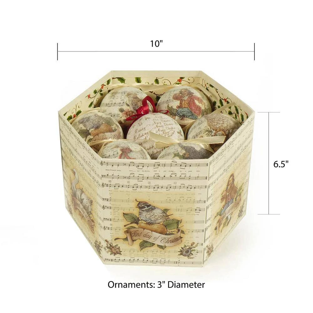 Nostalgic set of finely detailed ornaments featuring the 12-days of Christmas. 12 different illustrated scenes adorn these decoupage ornaments. These beautiful designs are finished with hand tied ribbons. Each set of 14 includes a designer gift box that doubles as storage for safe keeping. Celebrate many family memories with these affordable, quality baubles. Each individual ornament is 3 in. Dia x 3-1/2 in. H.