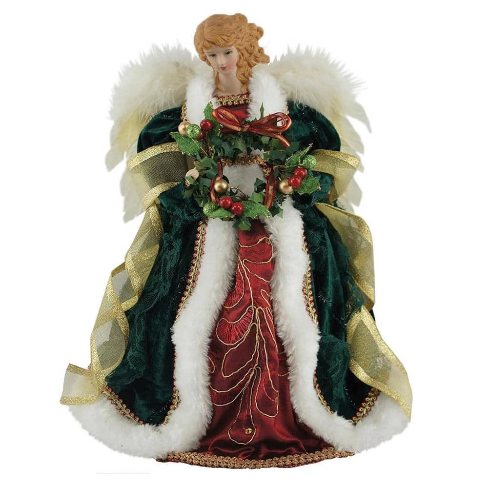 This 12 in. Christmas Angel Tree Topper is perfect for the Holiday tree. Her coat is dark green with white faux fur trim. Her dress is red and she is holding a Christmas wreath. To complete her look her wings are feathers.