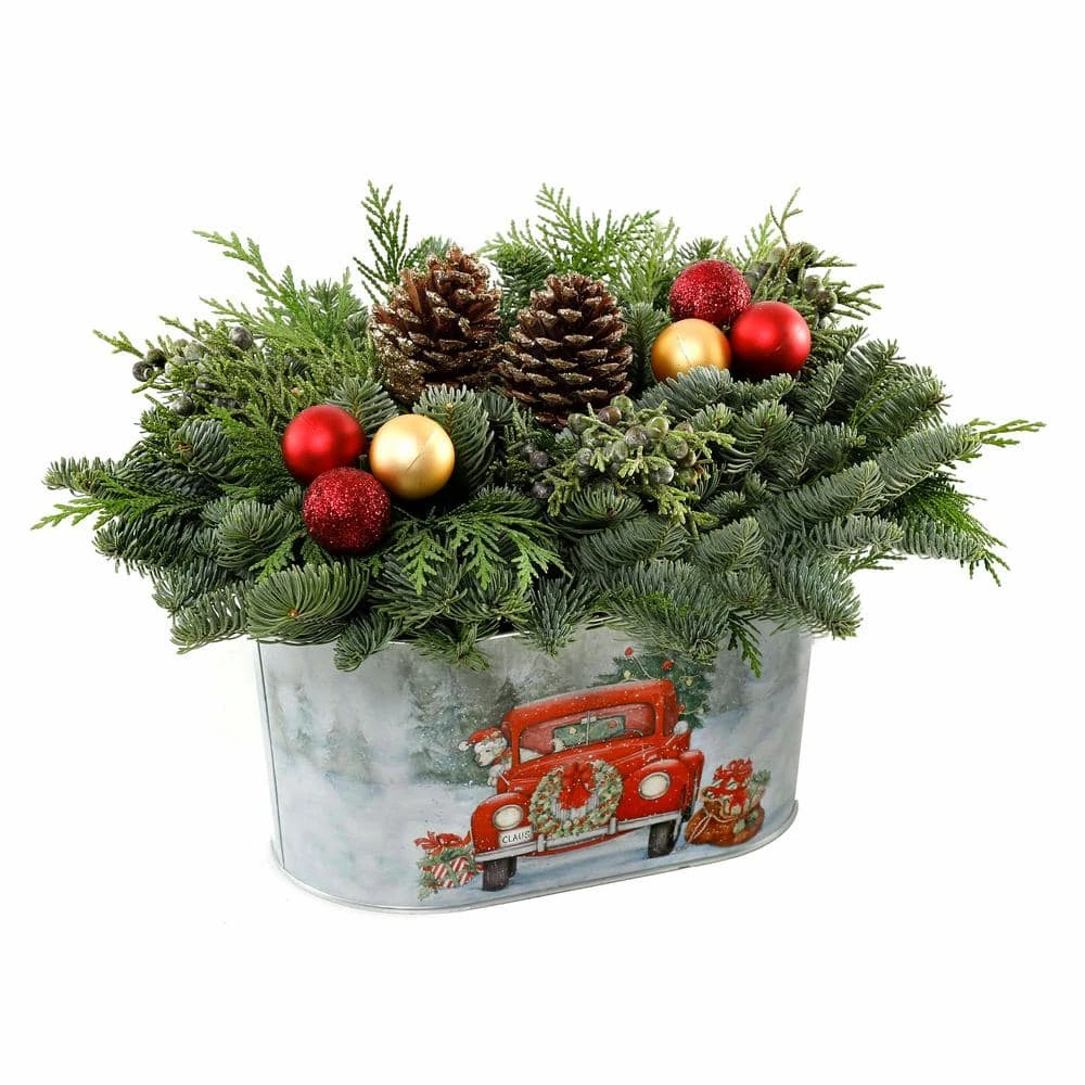 This 12 in. truck is the ideal holiday gift this year or can be perfectly display it in your home for many years to come. Arranged with Noble Fir, Western Red Cedar, Juniper, red berries and pinecones in the bed of the truck, the Decorative Tin Truck Centerpiece looks timeless in any setting. This included Christmas arrangement can be removed and switched with any decor/arrangements as the seasons change. As an added-bonus, the working wheels on this centerpiece will delight children and be a stunning addition to any home. Bring fun, charm and the Christmas spirit into your home with this beauty.