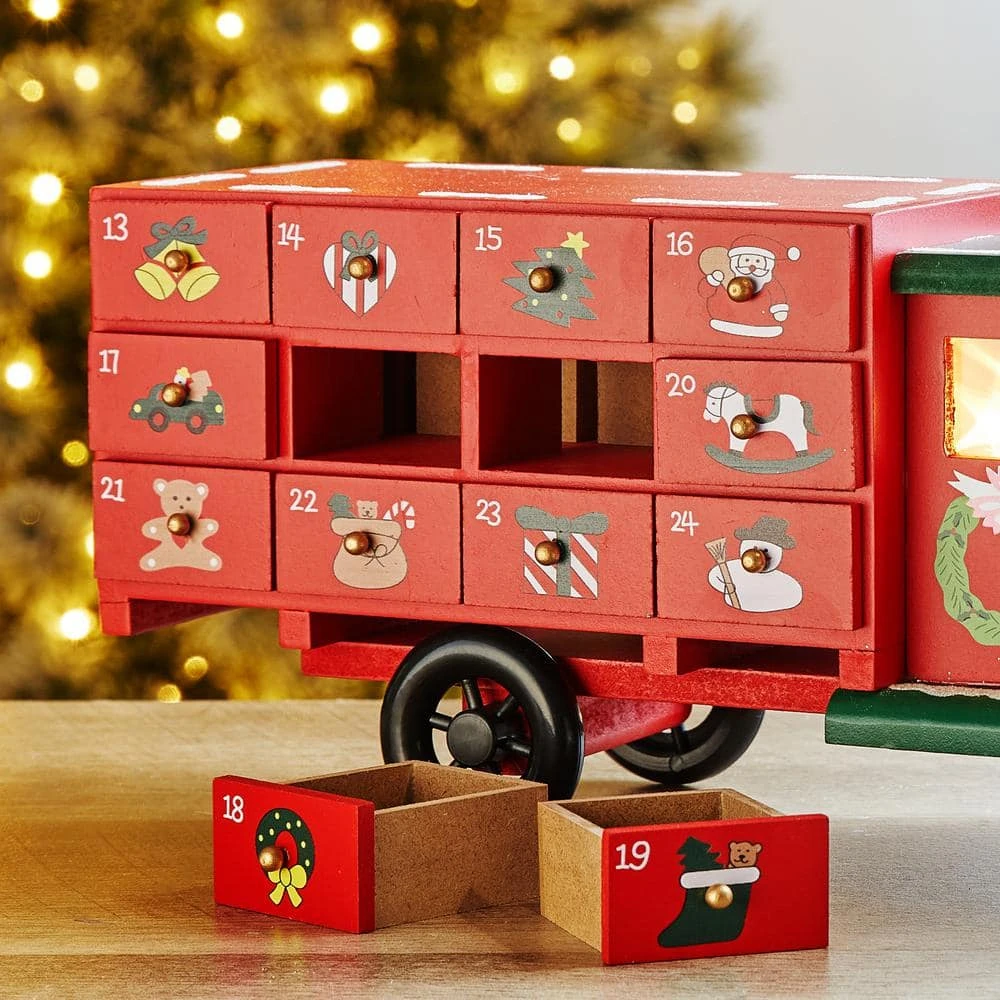 Countdown the-days until Christmas with this unique lighted red truck calendar. It has 24 drawers that can be pulled open to reveal an amazing treat each-day during advent. Each box is adorned with Christmas themed decorations such as snowman/Santa.