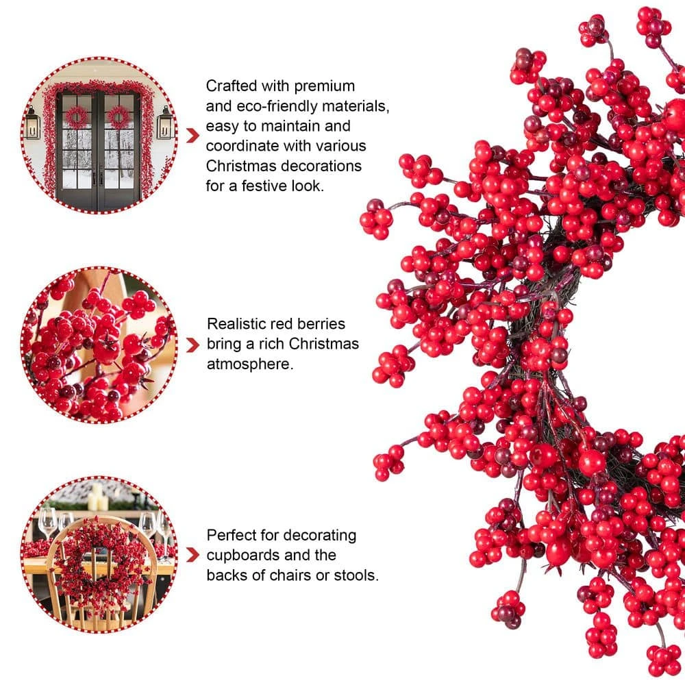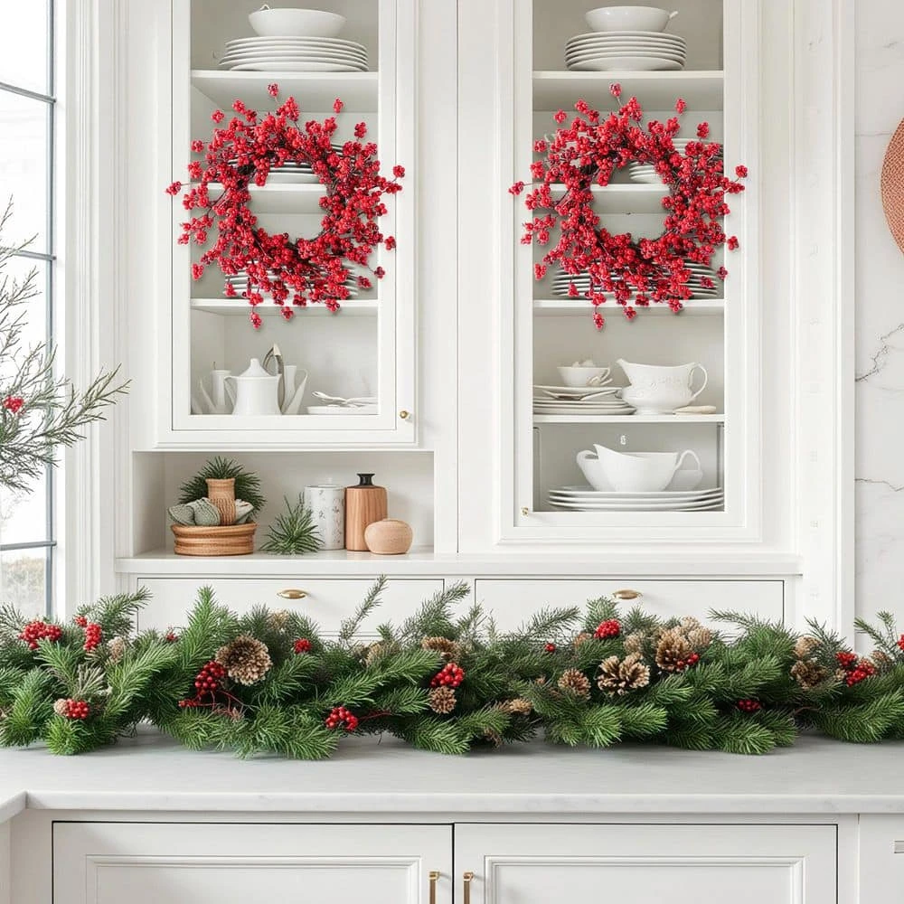 The Set of 2, 14 in. D Christmas Red Berries Wreaths feature vibrant red berries and greenery. It is perfect for decorating kitchen cupboards or the backs of dining chairs to celebrate the holiday season. Realistic red berries bring a rich Christmas atmosphere.