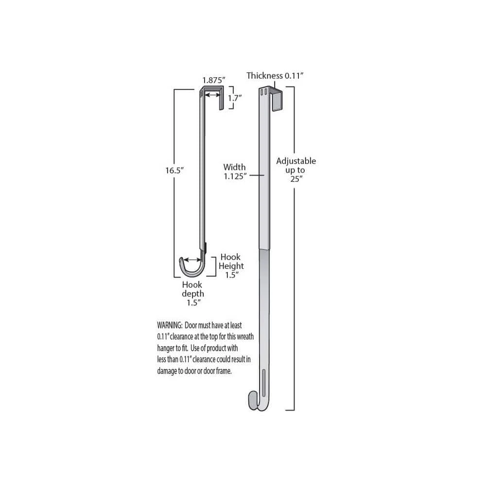 Forget about the nails or other hardware and hang your wreath with our Adjustable Length Wreath Hanger. Not all doors are created equal, this easy to adjust wreath hanger lets you choose the perfect height, extends from 16.5 in. to 25 in. The thickness of the metal above the door is approximately 0.11 in. which includes the felt thickness when compressed, about the thickness of 2 dimes.