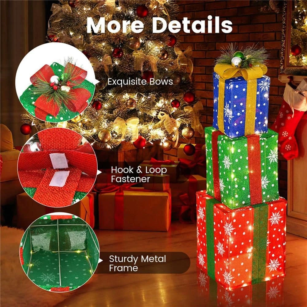 Get ready to dazzle this holiday season with our 3 PCS Christmas gift box decorations! These festive ornaments are a must-have for your home, adding a touch of magic wherever they’re placed. With a total of 52 pcs lights, your space will be filled with a cozy and festive glow. Not only are these gift box ornaments versatile, but they’re also incredibly sturdy. Made with tinsel fabric and a sturdy metal frame, they’re built to last for years to come. Assembling them is a breeze, thanks to their pre-assembled boxes. More details, like the hook & loop fastener, also facilitate its assembly. Whether you want to display them individually or stack them together, these decorations are perfect for both indoor and outdoor use. Don’t miss out on adding some holiday cheer to your space – merry Christmas with these beautiful ornaments!u003cbr>