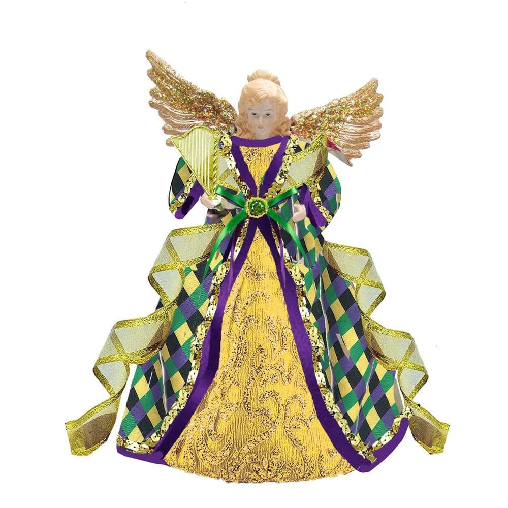 After the lights are strung and the ornaments and tinsel are hung, there’s one final step to make a Christmas tree perfect: placing a beautiful decoration on the very top. This exquisitely crafted and wonderfully detailed Angel tree topper is a perfect compliment to any tree. Dressed in a shimmering green, purple, black and gold gown with golden wings and holding a golden harp, this angel celebrates the joy and festivity of the Mardi Gras holiday. Enjoy the holidays in style with this elegantly handcrafted 16 in. Mardi Gras Angel Tree Topper that is sure to provide many seasons of pleasure.
