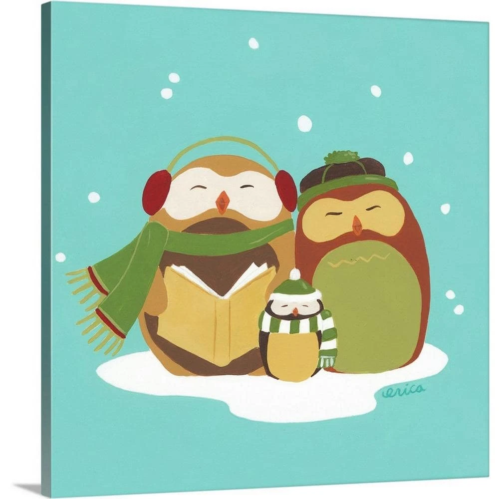 Solid-Faced Canvas Print entitled Happy Owlidays II . Our proprietary canvas provides a classic and distinctive texture. It is acid free and specially developed for our giclee print platforms. Each print is produced with our own archival UV quality inks supporting a vibrant color gamut, while being scratch and fade resistant. Each premium canvas gallery wrap is finished with a closed back preventing dust collection inside the back of the wrap. The back includes a pre-installed, ready-to-hang sawtooth hardware.