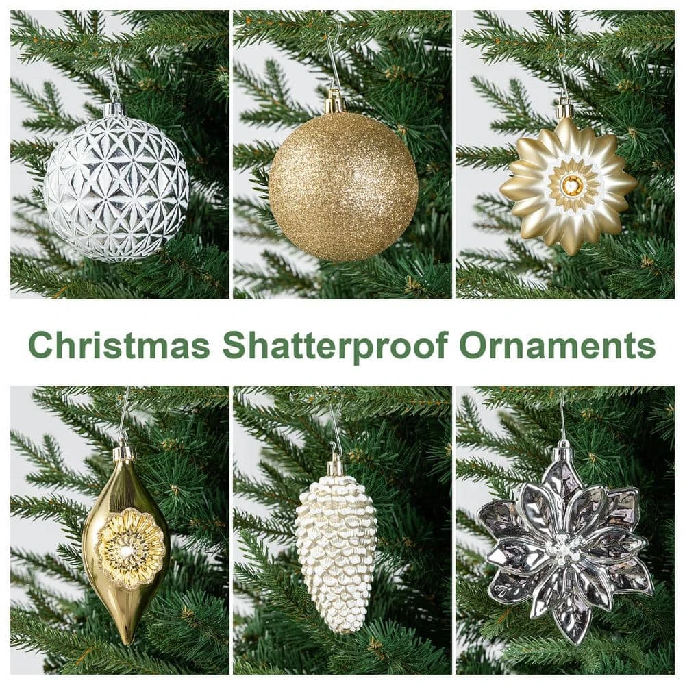 Enjoy the convenience of our set of 160CT shatterproof ornaments, featuring a variety of sizes and designs that effortlessly combine into 1 cohesive decoration set. Save time and energy by eliminating the need to select individual decorations, allowing you to quickly adorn your tree with ease. Add to the festive atmosphere.