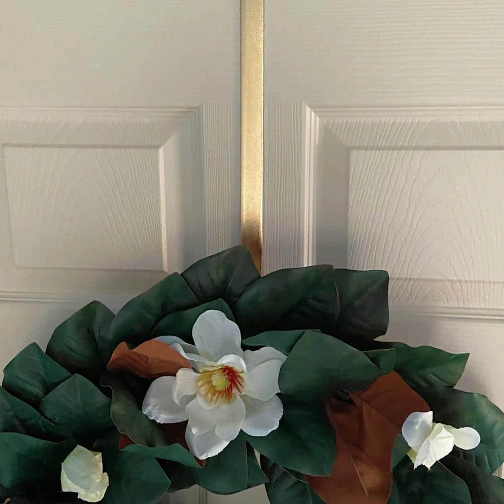 This beautifully crafted dual-sided wreath hanger allows for hanging seasonal decor on both the outside and inside of the door with ease. Pads on the back protect from scratches, and holds up to 20 pounds on both sides. 18 in L on one side, 12 in. long on the other. Beautiful glimmer finish. Indoor or outdoor use.
