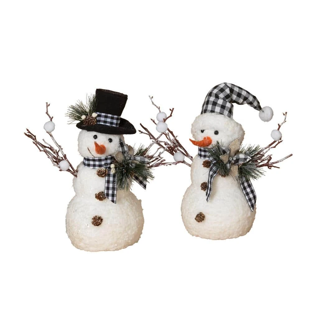 At 18 in. H, this adorable pair of snowmen are realistic looking. Made with the perfect texture show and decked out for winter. With twig arms holding snowballs, carrot noses and pine cone summarys they look like someone had fun building them. Adorned in black and white plaid with holiday greenery adds a touch that will tie in with any decor.