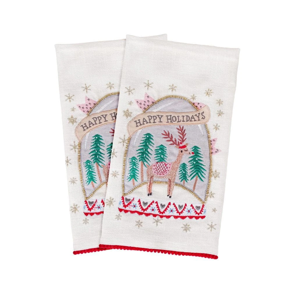 These decorative Christmas themed towels feature a large snow globe containing evergreen trees and a reindeer wrapped with a banner reading “Happy Holidays”. Metallic threads and gold beading add sparkle to the 100% cotton fabric. These decorative towels are such a nice accent during the Holidays.