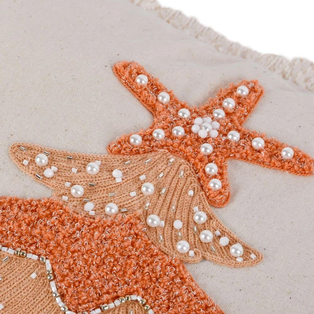 This beach-inspired pillow showcases a Christmas tree made from stacked seashells, topped with a starfish. The tree is decorated with assorted pearl beads and delicate bead strings. It’s a unique, coastal twist on holiday décor.