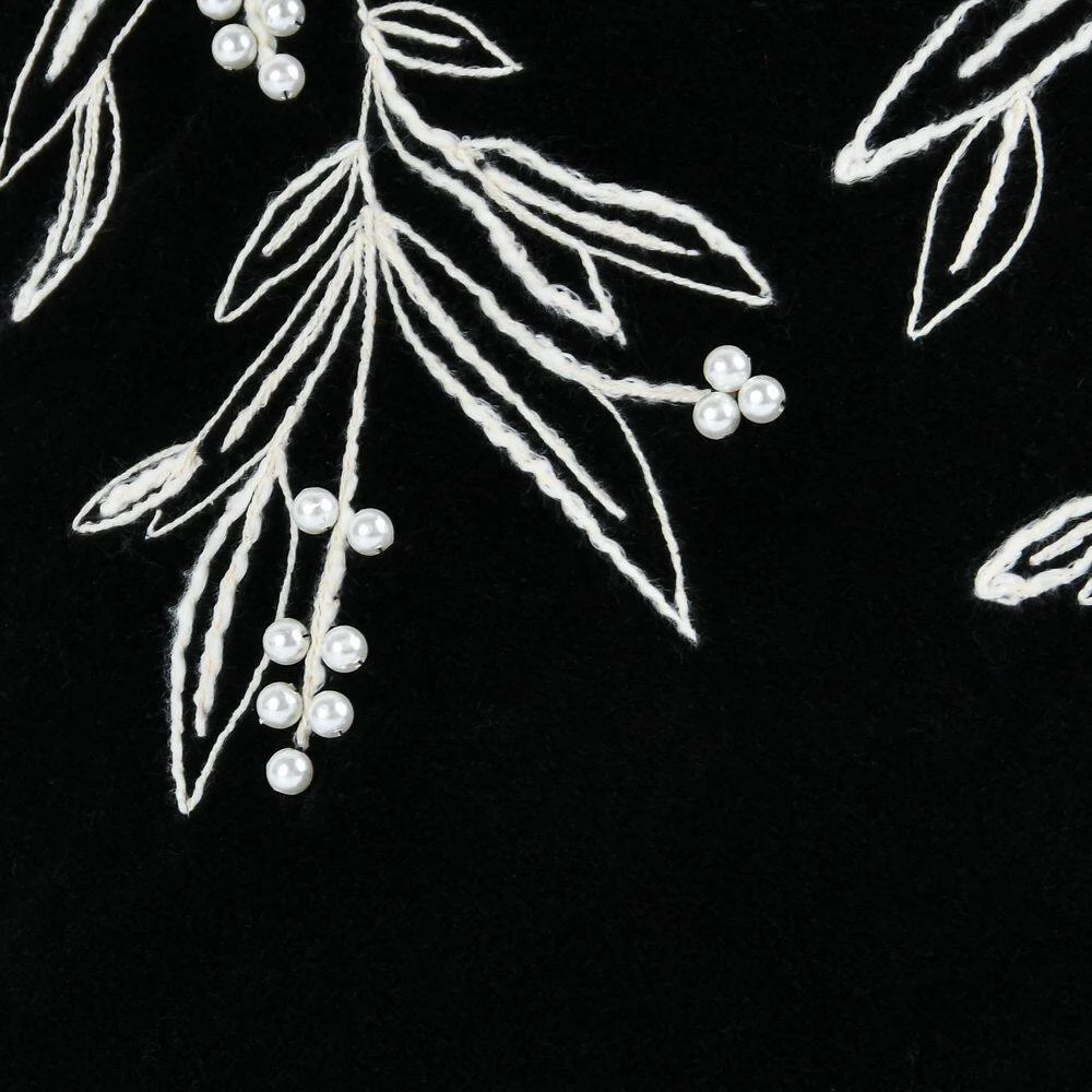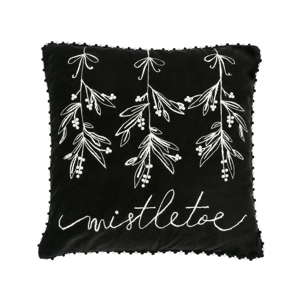 This deep black velvet pillow showcases bright white embroidered mistletoe flowers, each accented with pearl bead berries. Below the delicate design, the word