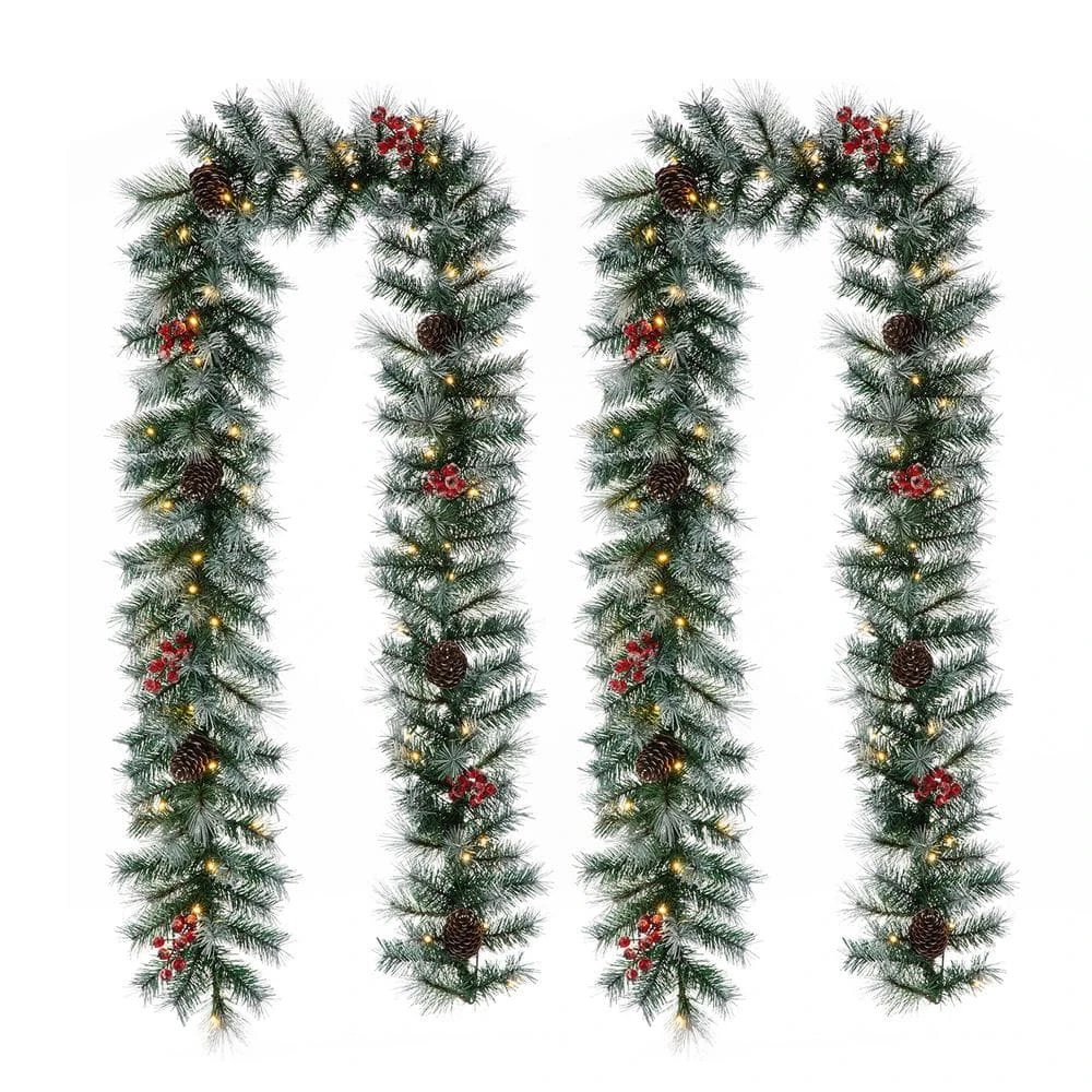The 9ft Frosted mixed tips Pine garland provides ample length to easily adorn doors, mantles or banisters, making this versatile decoration ideal for any situation. Each of the 150 tips is modeled to a pine tree’s while the frosted design creates a winter wonderland around your home. Red berries and pinecones among the needles add an extra holiday touch to this garland. It creating the perfect holiday touch for your home.