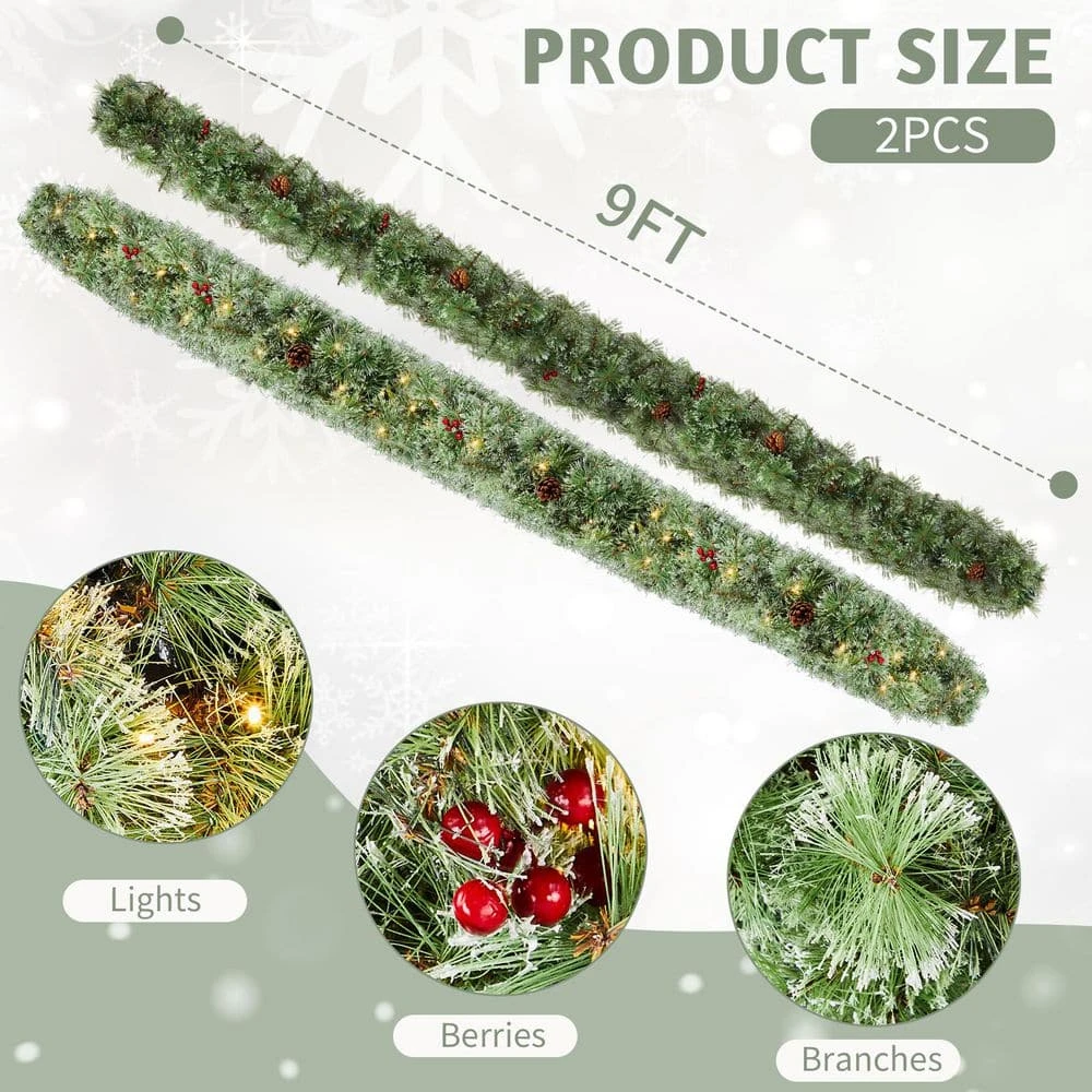 Celebrate the season with timeless elegance using this 2-pack of pre-lit snow flocked Christmas garlands. Each 9-foot garland is crafted with 440 dense branch tips and sprinkled with a frosted snow effect, creating a realistic winter wonderland look. Bright red berries add vibrant contrast, while 200 warm white LED lights with 8 lighting modes bring cozy illumination to any space. Whether draped along a staircase, mantel, entryway, or porch, these garlands offer a festive way to welcome the holidays into your home. Battery-operated and easy to style, they’re perfect for both indoor and covered outdoor use.