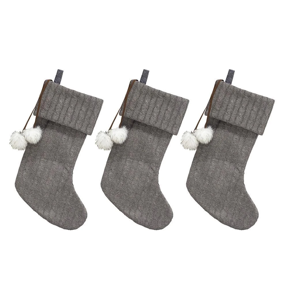 The New Traditions Cable Knit Stockings come in a (set of 3) Christmas stockings designed to bring simplicity and cheer to your holiday decorations. Each measuring 2 in. L, these full-size stockings are large enough to accommodate an abundance of stocking stuffers and gifts, the stockings are made from a soft red cable knit and feature 2-fluffy ivory faux fur pom-poms that dangle from the top of the wide folded over cuff the Christmas stockings include a matching red fabric loop so they can be hung by the fireplace mantle with your other family Christmas stockings. These red cable knit stockings with faux fur pom-poms create a cozy and modern feel in your home for the holidays.