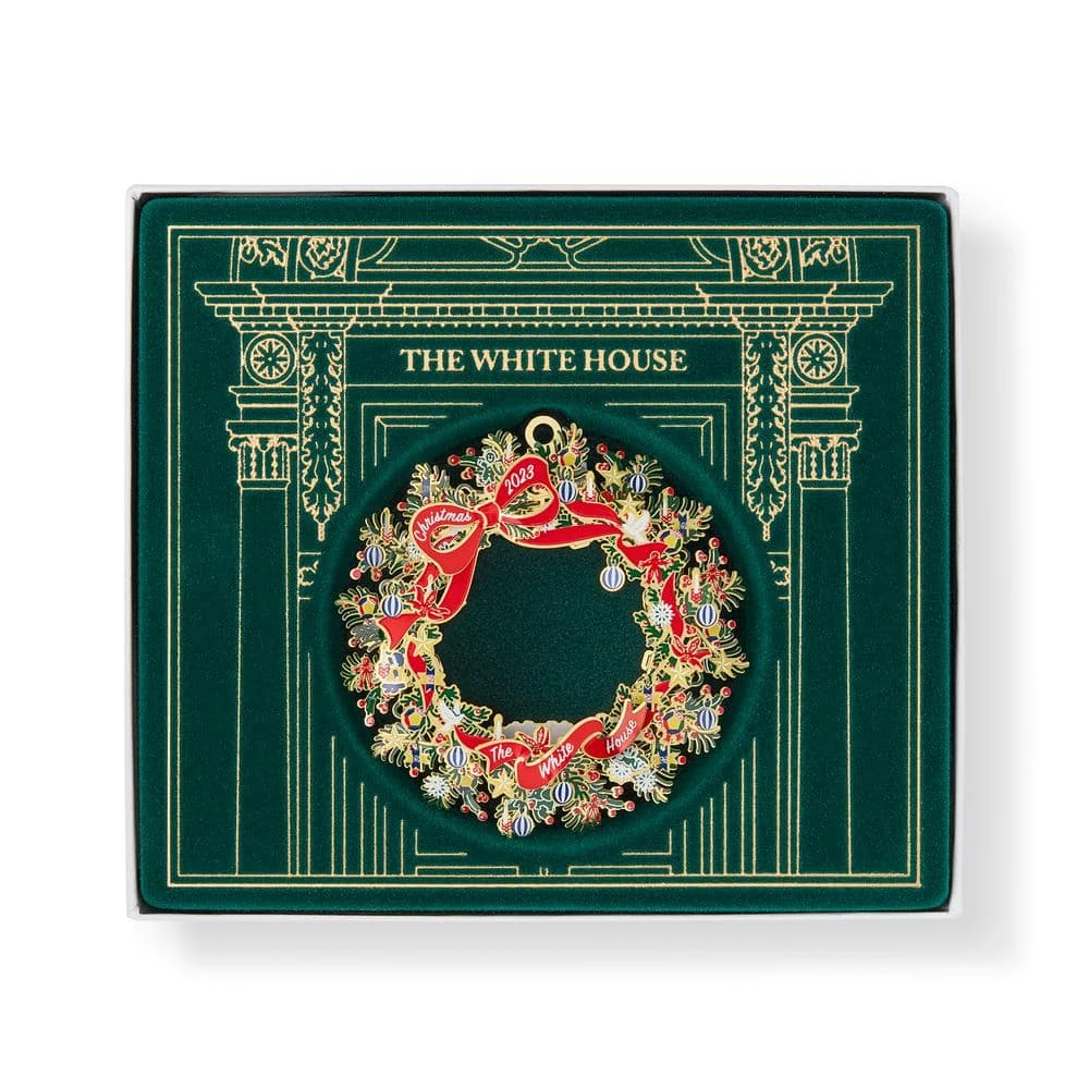 - A festive holiday wreath, adorned on the front with decorations inspired by the handcrafted Christmas ornaments used in the White House during the Gerald R. Ford Jr., administration.