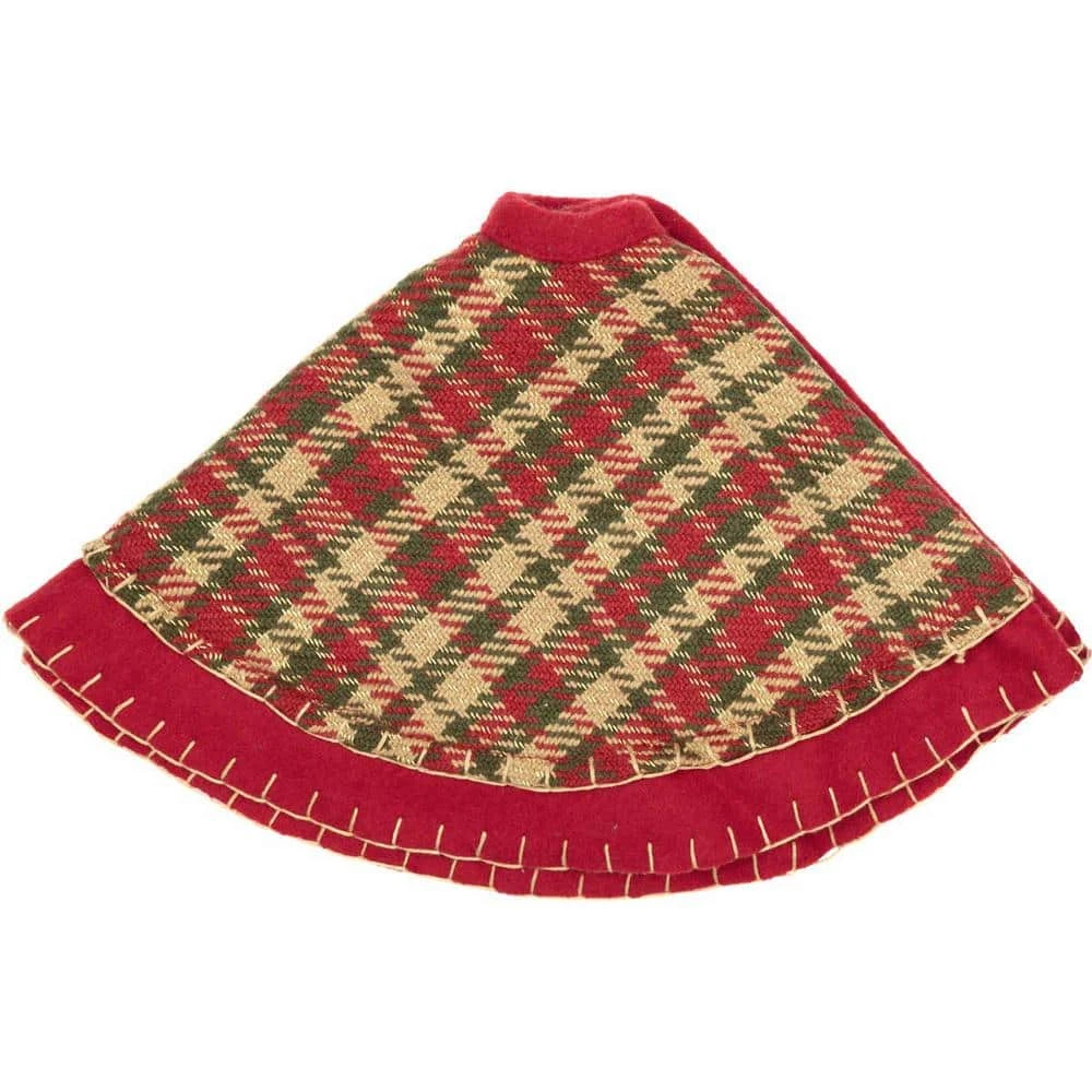 The Claren Mini Tree Skirt is a cheery but tried-and-true mix of red, green and tan interwoven with a sparkle of gold thread throughout for true Holiday spirit under the tree. The plaid adorns the skirt and is finished with red felt along the border with whip stitching completing the heirloom look. Reverses to solid cherry red felt.
