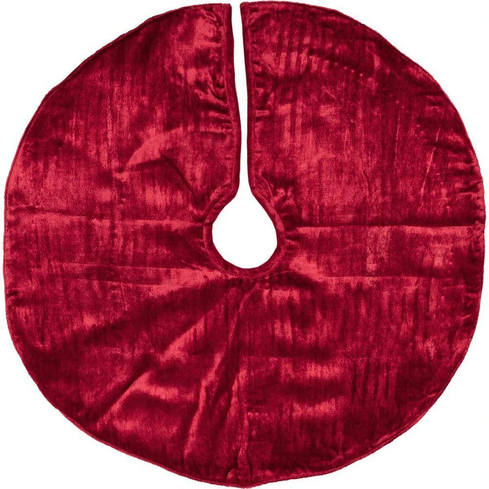 Display an elegant touch under the presents this year with the Memories Red Mini Tree Skirt. Displaying soft, shiny Christmas red velvet accompanied by rows of circular gold trim with flannel lining. This item was made with care to decorate your home for many years.