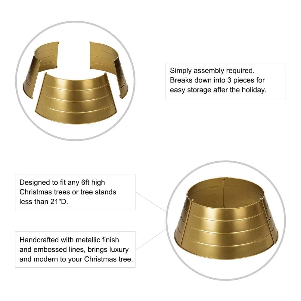Add the final touch to your Modern Farmhouse Christmas with this Gold Metal Tree Collar. Made for 6ft high trees, any shapes or colors, the versatile design works with a variety of holiday decor. This unique tree collar keeps everything neatly contained, producing a streamlined look underneath your tree.