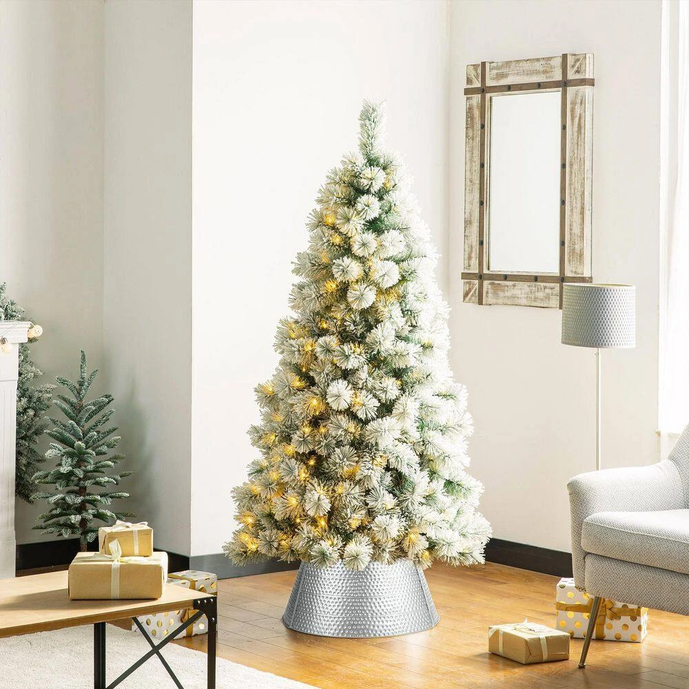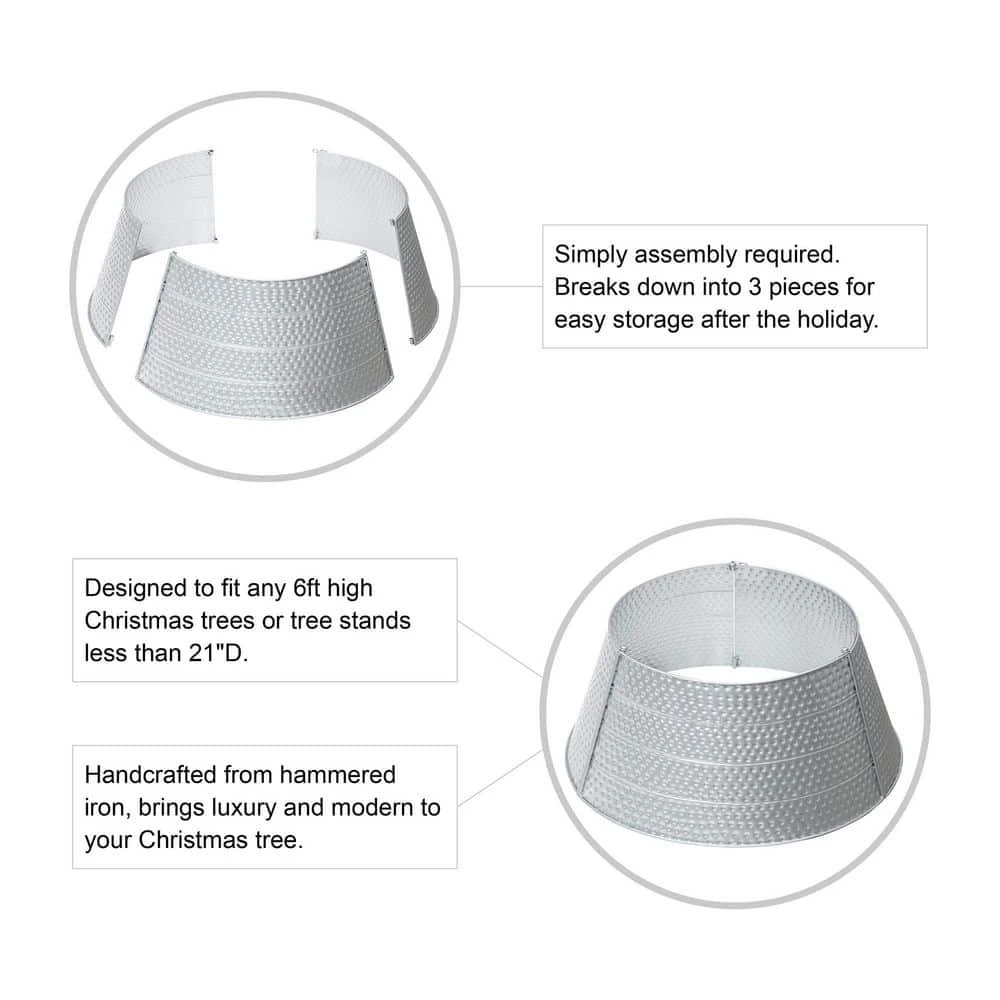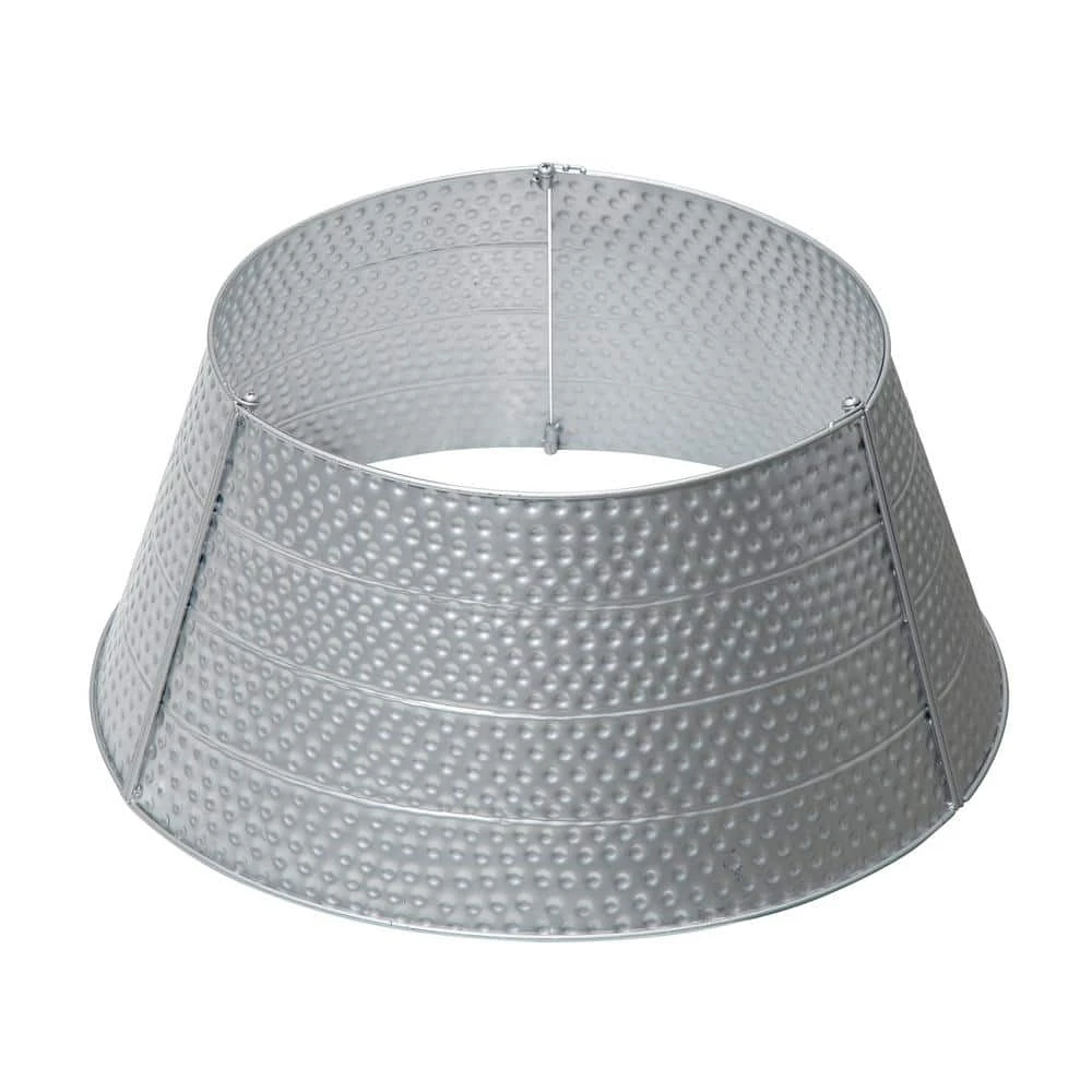 Add the final touch to your modern Christmas with this silver hammered tree collar. It slightly flares out toward the base, which creates simple framing and covers the trees stand. Made from sturdy metal, you can use this collar for seasons to come.