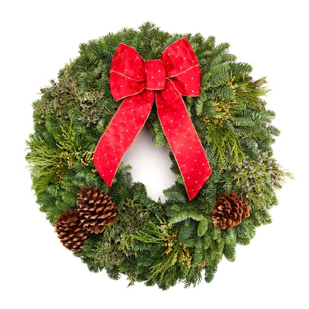If you are looking for one of the most beautifully scented and aromatic Christmas wreaths, that also offers some of the best needle retention abilities, this is the wreath for you. This freshly cut Noble Fir and Cedar wreath also helps ring in the Christmas season with decorative additions of festive and 100% natural Holly berries and beautifully textured Ponderosa pine cones. The natural blue-tinged green coloring of Noble Fir also does well to complement the soft tones of cold, crisp winter air outside when hung on the front door and the delightfully powerful citrusy fragrance of the Cedar needles is sure to turn the heads of both friends and family as they arrive for the holidays. This live wreath measures 22 in. Dia and is handmade in the Pacific Northwest using only the highest quality of natural freshly cut foliage in its assembly to ensure that you receive an arrangement that will make this Christmas memorable for years to come.