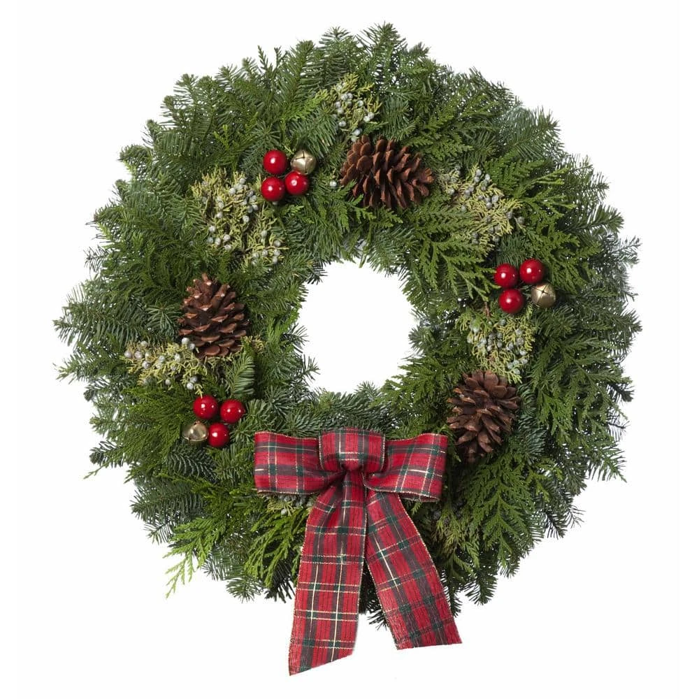 As one of our most festive wreaths, the Jingle Bell Wreath captures the essence of both the scent and sounds of the holiday season. With a festive bow, red berries, fragrant pinecones and evergreens including grand appearing Cedar, this wreath will help ring in the Christmas spirit, especially when placed on any high-traffic door. At 22 in. in diameter, the eye-pleasing Jingle Bell Wreath is sure to delight anyone walking into your home. If you are a fan of jingle bells or would like an eye-pleasing pair, please also see our Jingle Bell Wicker Basket Centerpiece.
