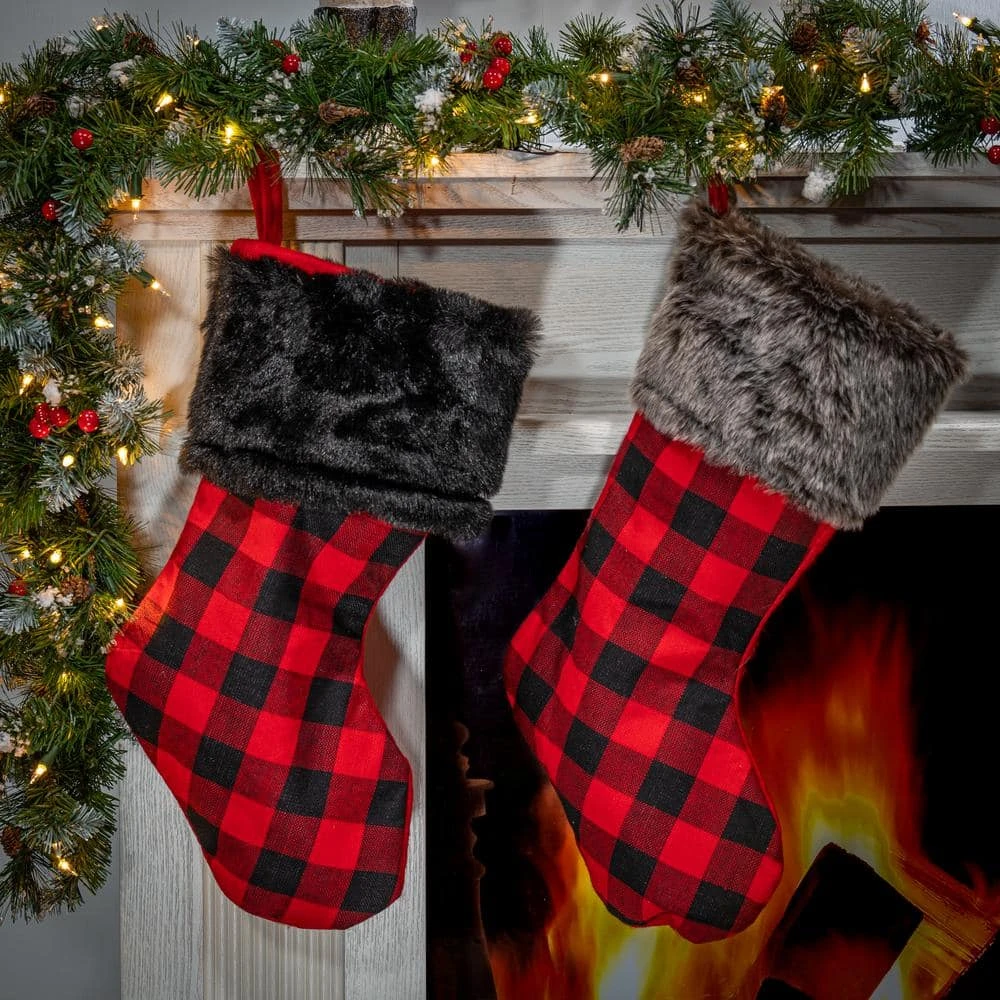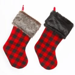 Bring the rugged outdoors inside with this set of 4 faux fur trimmed timeless red and black buffalo plaid stocking. These 23-in H will look great hanging on your mantel. 2 colors faux fir, black and gray.