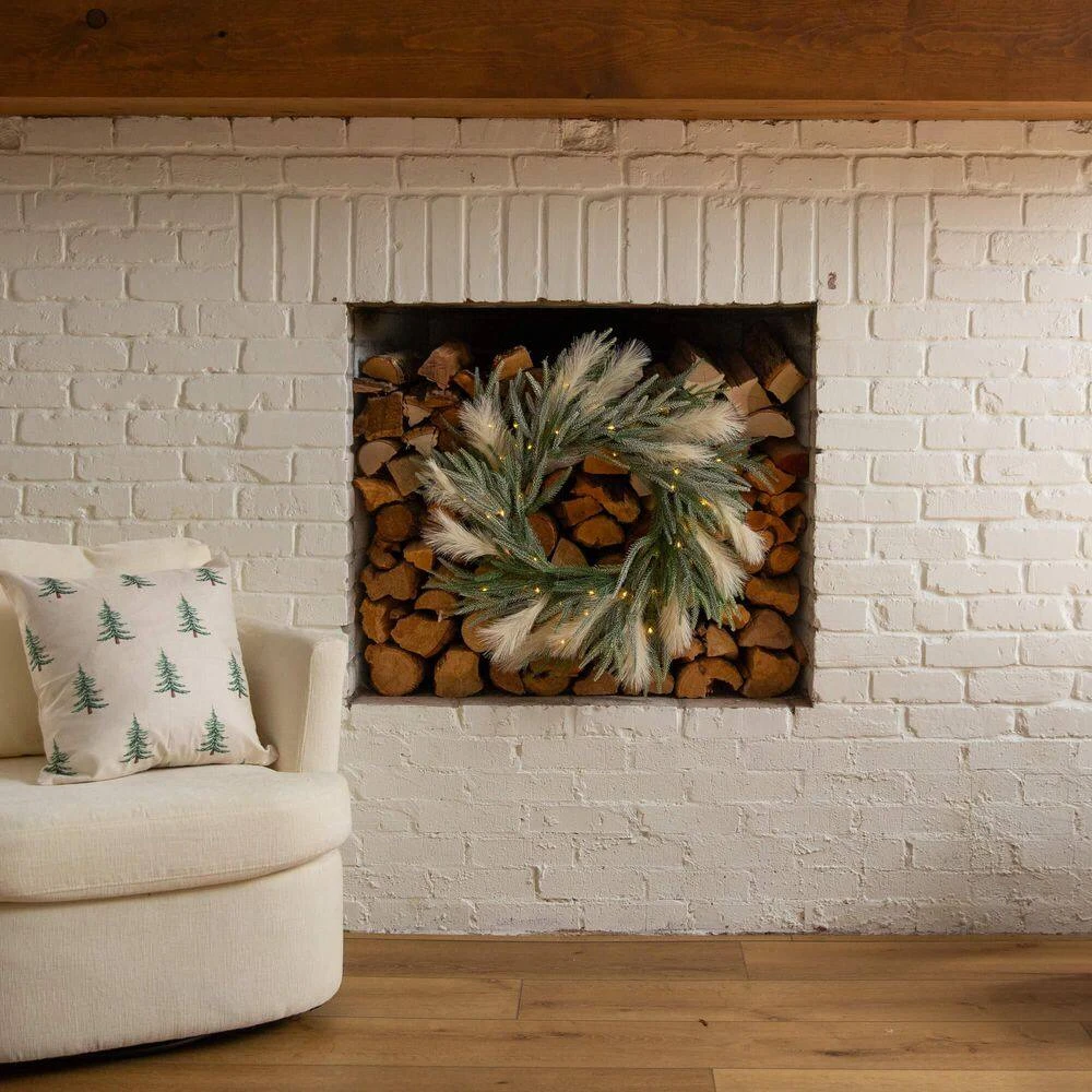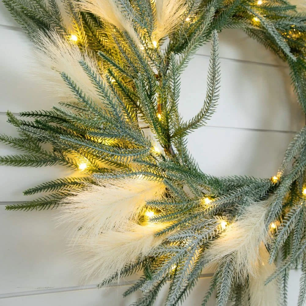 Add a playful twist to holiday traditions with this artificial balsam fir pampas wreath. This unique design combines realistic fir branches with soft, fluffy pampas grass, all illuminated by 50 multicolor LED lights that create a vibrant, festive glow. This piece offers a fresh take on holiday decor with a trendy foliage that brings warmth and cheer wherever displayed. The multicolored lights add a playful energy. With a diameter of 24 in. hang this no-fuss decoration in any space that needs a holiday refresh. Hang on a neutral wall and watch as it shines, or display as a centerpiece in a dining table.
