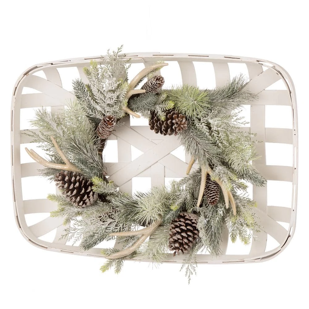 Adorn your home with lots of holiday style. Christmas Mix Basket Wreath features a grapevine base adorned with glittered greenery including a mix of different types of tree needles and pine cones, and especially resin antlers that give your holiday a woodland feel and touch. Affixed to the back is a square, shallow woven basket that gives this piece a holiday-inspired feel. It’s perfect for decorating your front door or for use as an entryway feature to greet you guests this holiday.
