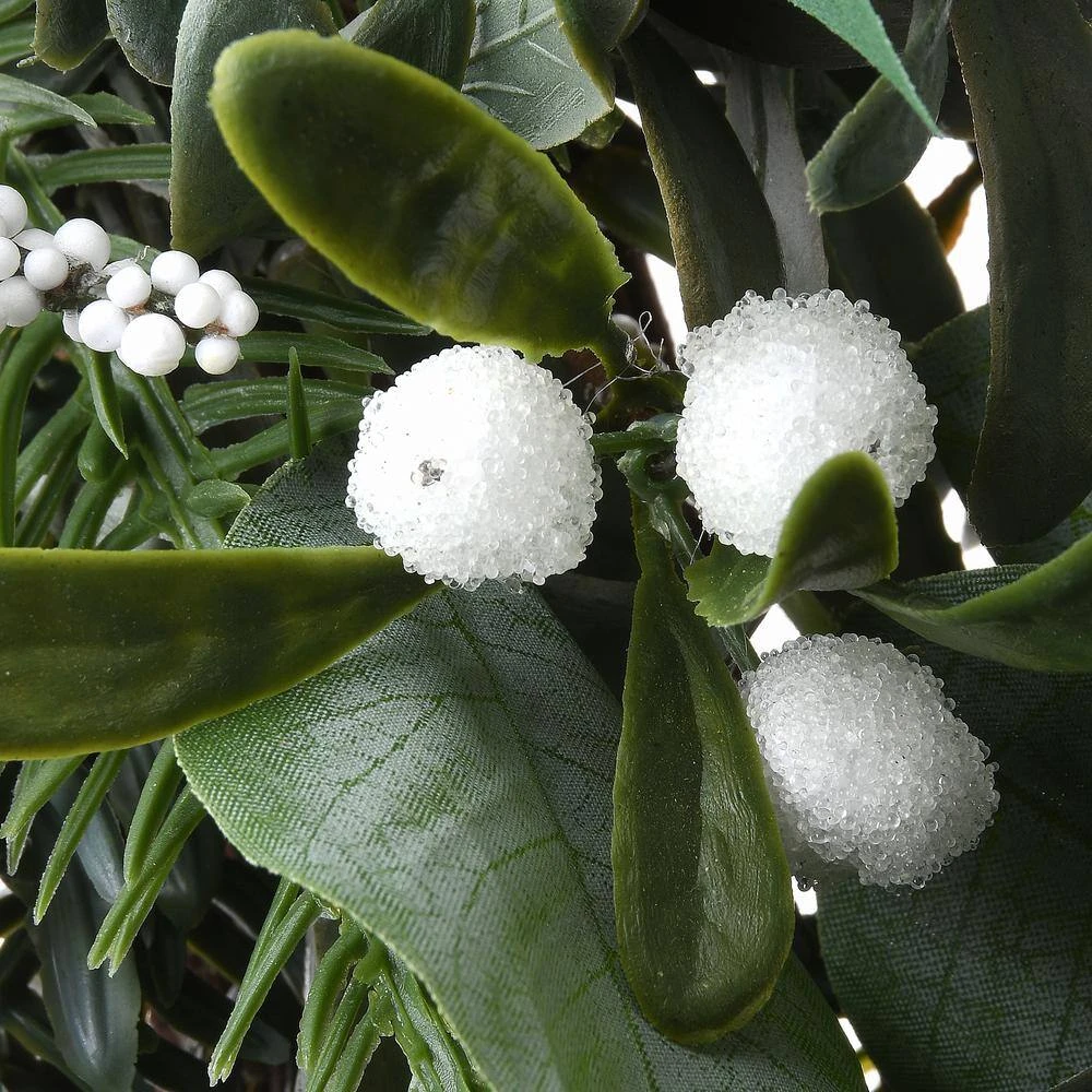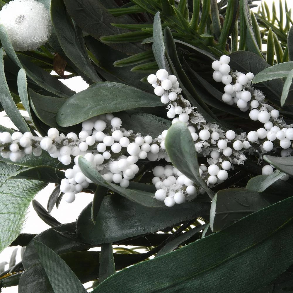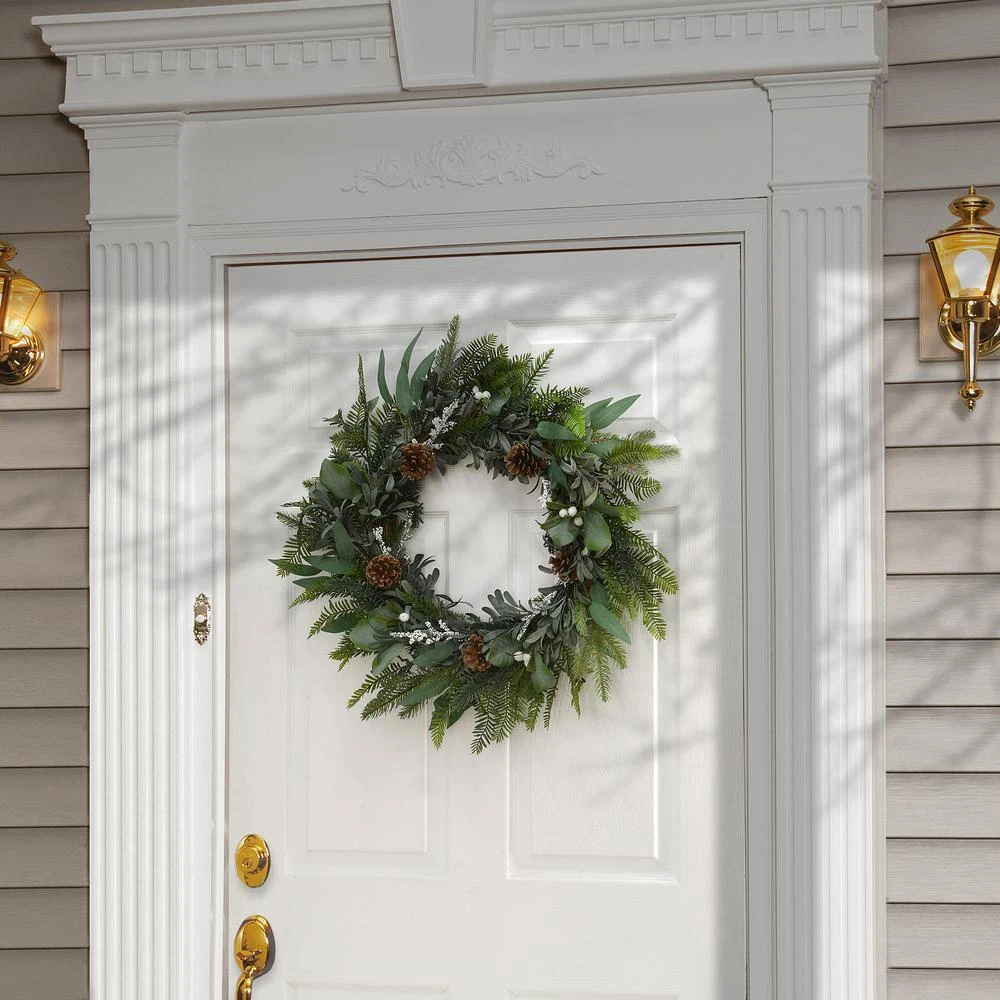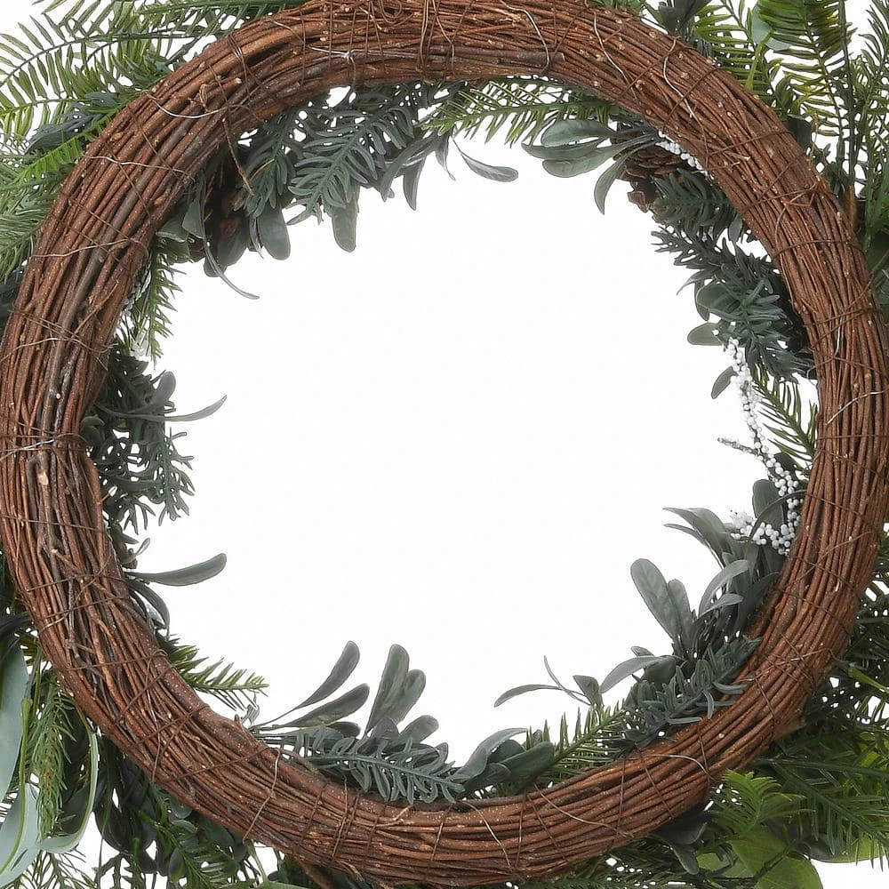 This wreath features a swirl of soft evergreen tips and leaves in assorted designs, all in soothing pastel green colors, flowing from a woven branch ring base. It is trimmed with pinecones and clusters of white berries for added natural appeal. Display this seasonal decoration on doors, walls and windows in indoor or covered outdoor locations.