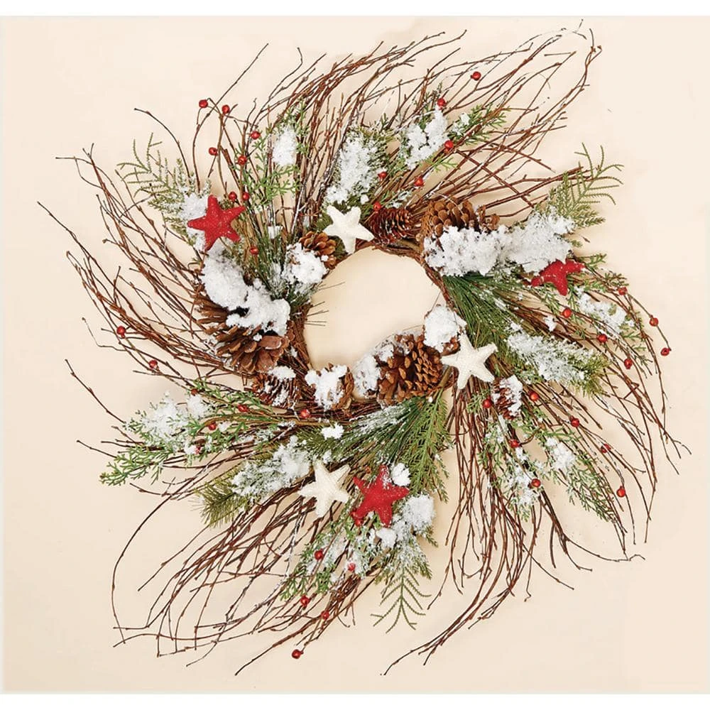 Impress your guests during the Holidays with this stunning Snowy Twig Wreath. It has a combination of twigs, starts and pine cones, perfect accent to any Holiday decoration. Place it on a door or wall.