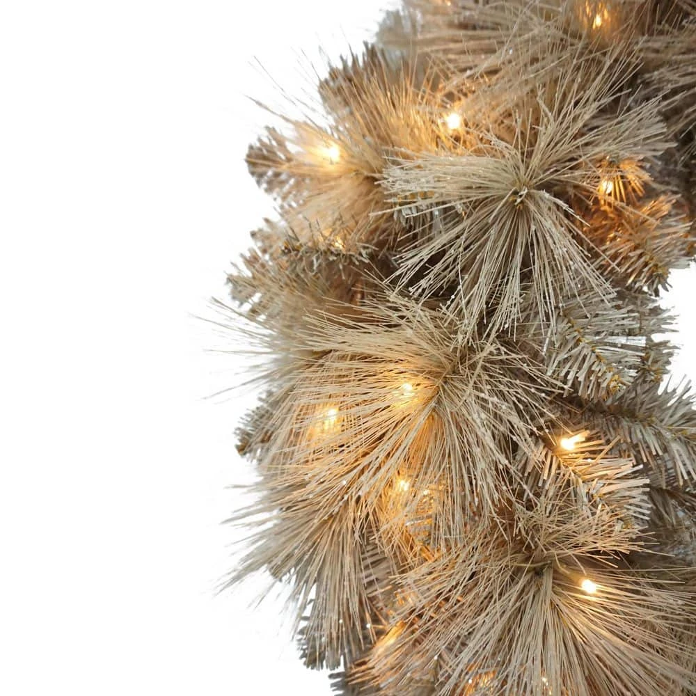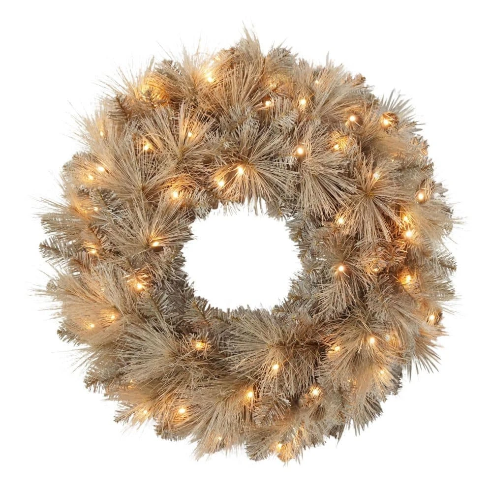 - 24in. pre-lit battery-operated on/off timer christmas wreath: comes with 35 led warm white lights, providing a soft, inviting glow the lights are already integrated, so there is no need for extra installation and comes with an 8-16 hour on/off timer for your convenience please note: 3 aa batteries are not included with the puleo international 24in. battery-operated pre-lit tan wreath with 35 warm white lights