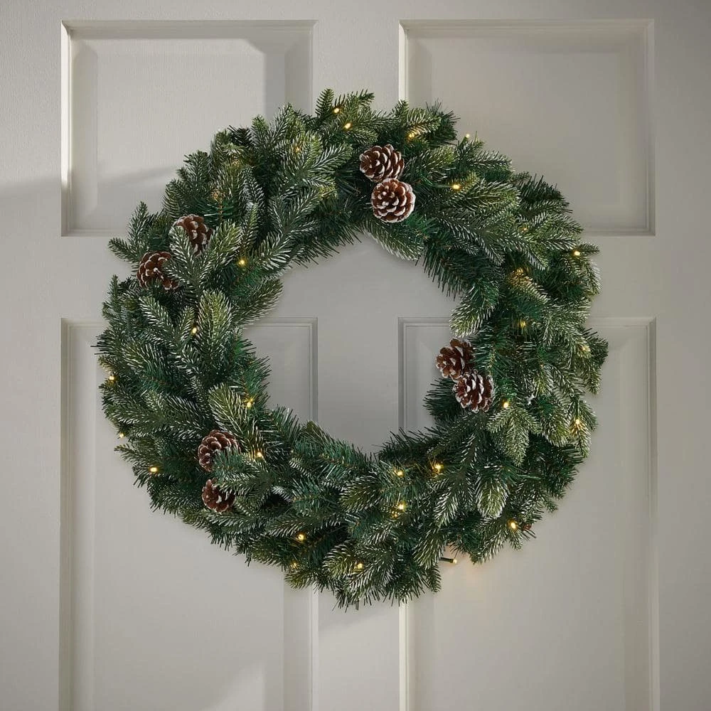 Greet the holidays with festive cheer by bringing some eye-catching decor for your home. Our Christmas wreath offers your home a splendid ring of deep green mixed spruce needles, pine cones, and shimmering LED lights to complete the look. These lights come with a convenient battery box, creating the perfect decorative accessory for any blank space. Featuring a sturdy iron frame to keep its shape, this lovely wreath offers a beautiful classic arrangement that will bring holiday cheer to your home for years to come.