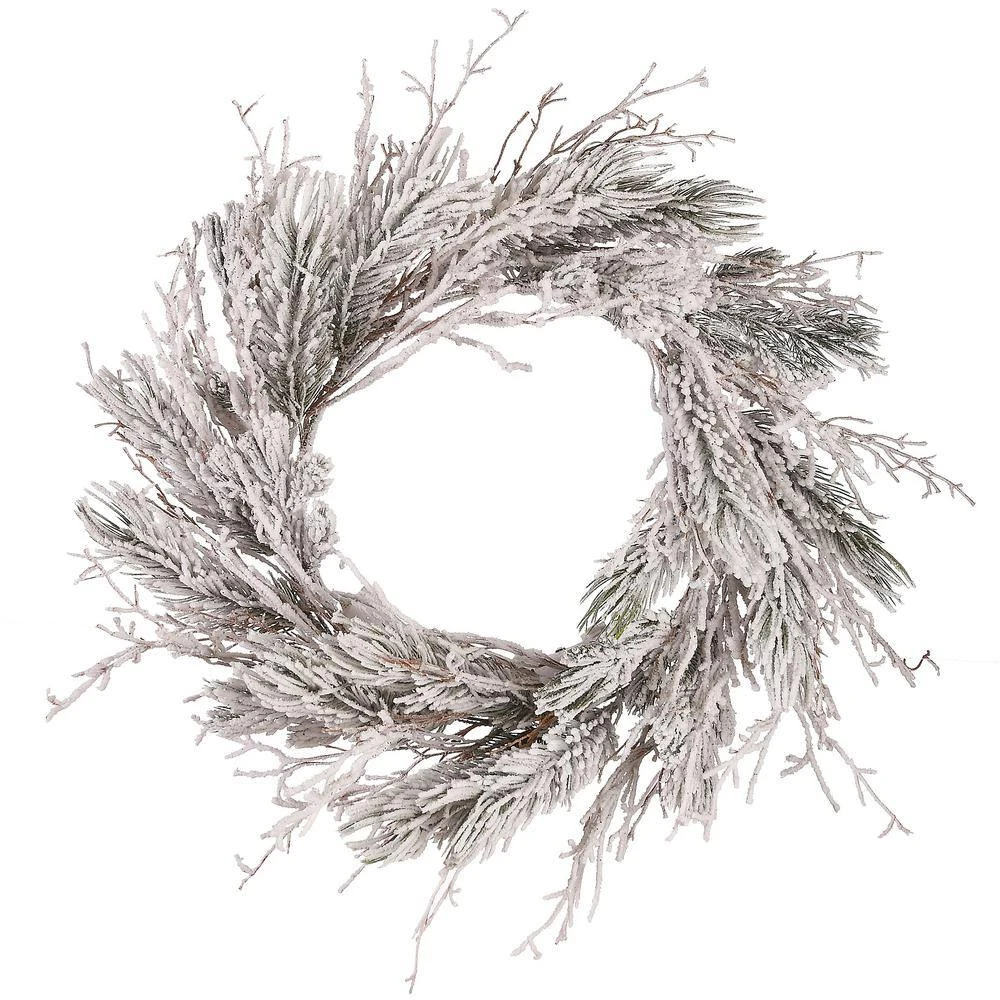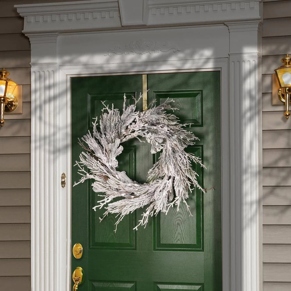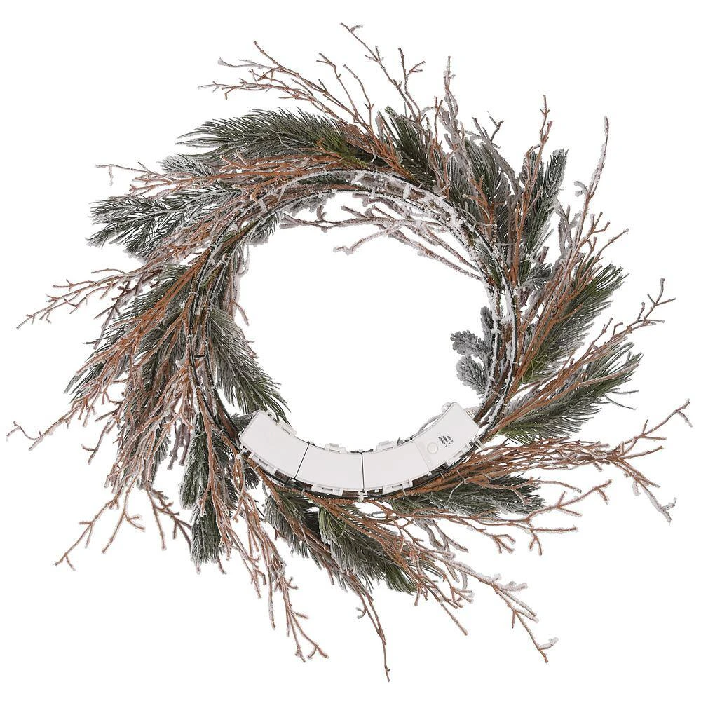 This holiday wreath features thick snow-crusted evergreen tips and long slender branch twigs, swirling around a sturdy wire ring base. It is lit with 150 battery-operated warm white LED Infinity Lights which are micro-LED bulbs built right into the light strings. This design allows for an increased volume of lights and cleaner overall look that provides a distinctly elegant result. Included is an option for 6-hours ON/18-hours OFF timed operation. Also included is a convenient handheld remote to control the lights. This wreath can be displayed on doors, walls and windows in indoor or covered outdoor locations.