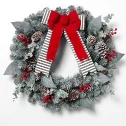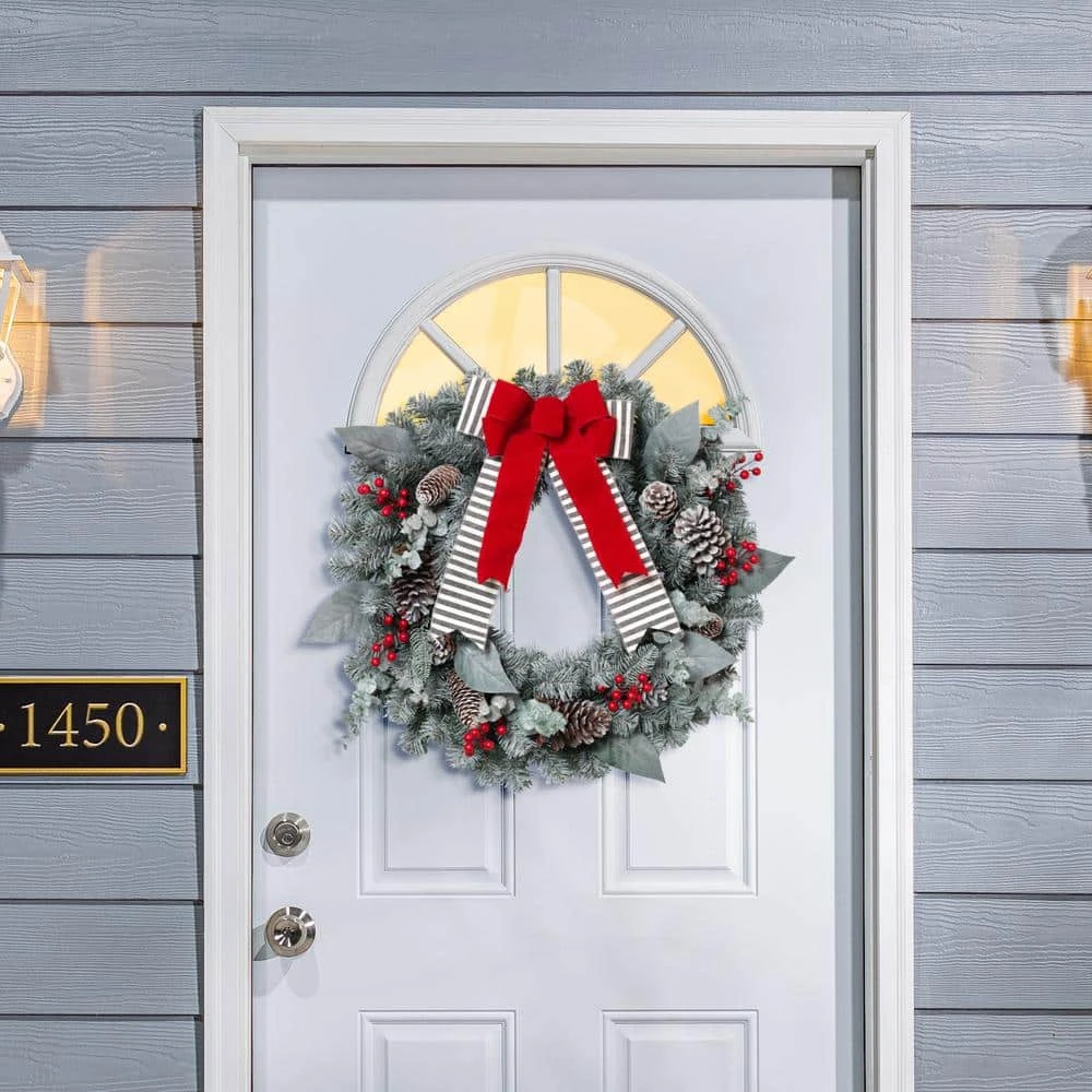 This 24 in. diameter wreath is the perfect size to hang on your front door this holiday season. Topped with its cheerful and festive red bow, perfectly placed holly berries, and lifelike eucalyptus leaves weaving throughout the pine sprigs, this wreath is perfect to transition from December through the New Year and beyond. This traditional wreath will create a warm welcome for all of your friends, family, and guests throughout the holiday months. Intended for either indoor or outdoor use.