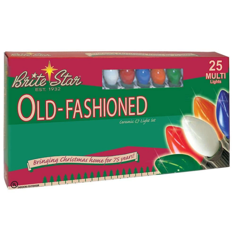 This set includes 2 box of multi colored old-fashioned lights. The big C-7 bulbs will bring back memories of Christmas-past. Each strand measures 25 ft. Replacement fuses included.