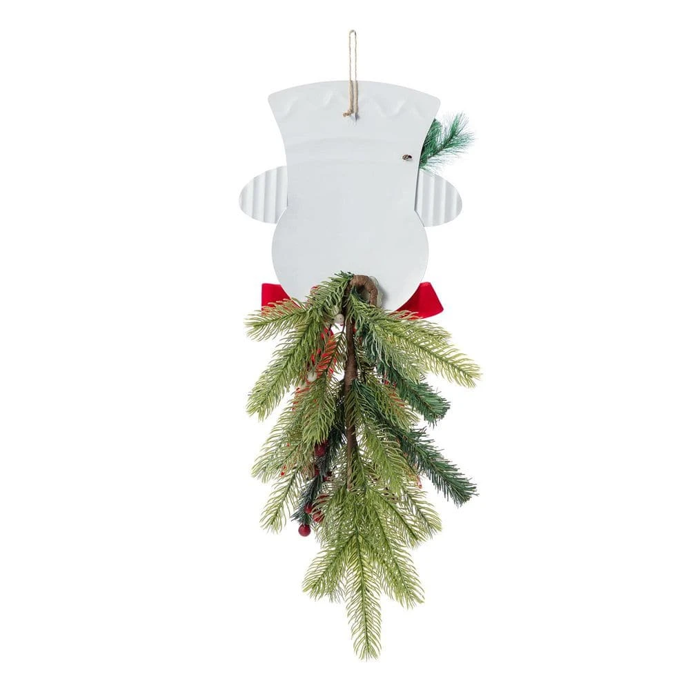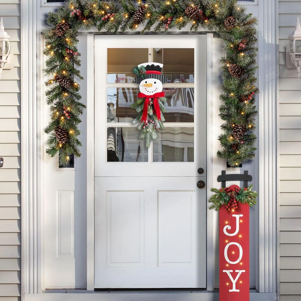 This festive decoration features a cheerful snowman with a black top hat and vibrant red bow tie, creating a charming holiday display. Adorned with lush greenery and accented with red and white berries, it adds a warm and welcoming touch to your home. Perfect for entryways, it brings joyful seasonal spirit to your Christmas decor.