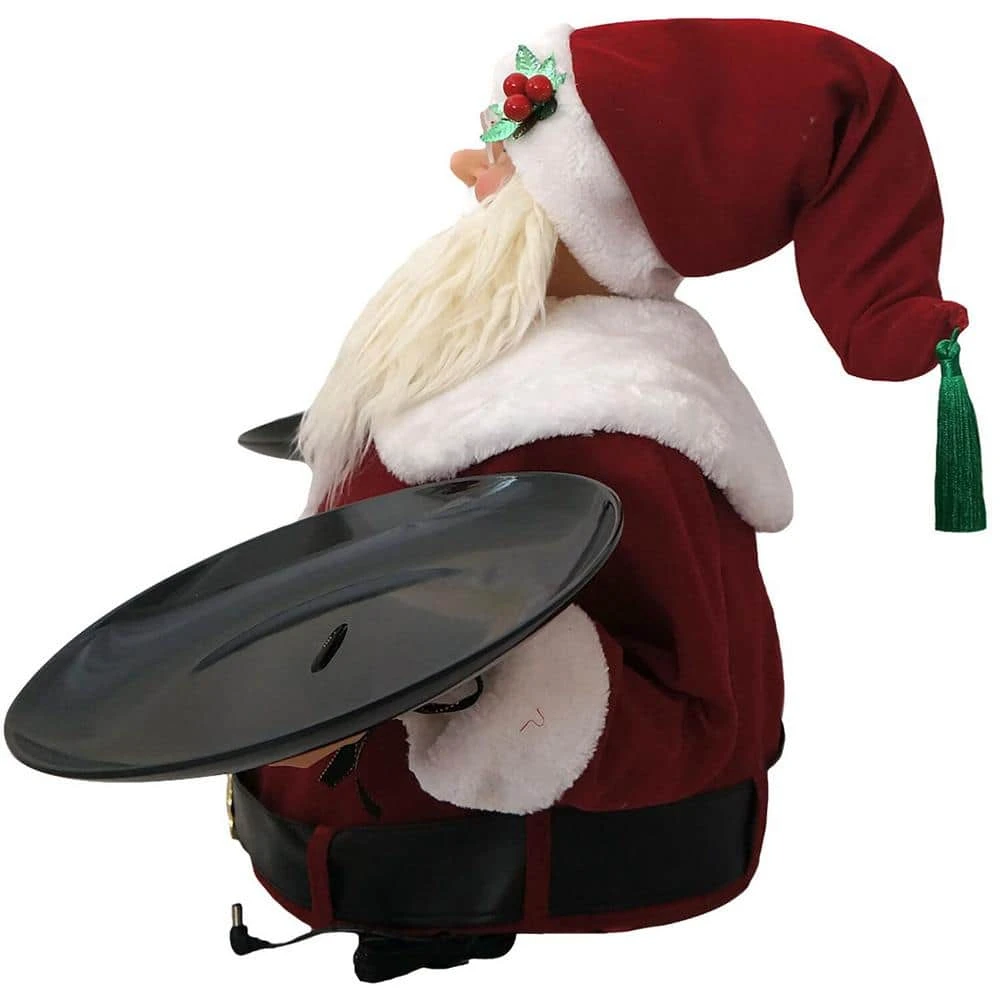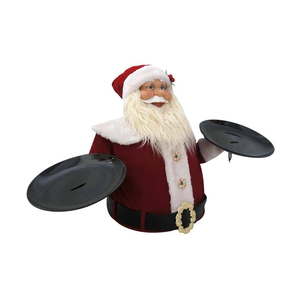 - CHRISTMAS SPIRIT: Spreading 3 feet wide and dressed in a festive suit, Santa Claus is the perfect table accessory for your next Christmas party. He holds 2 empty plates, one in each hand, ready to serve your holiday goodies.