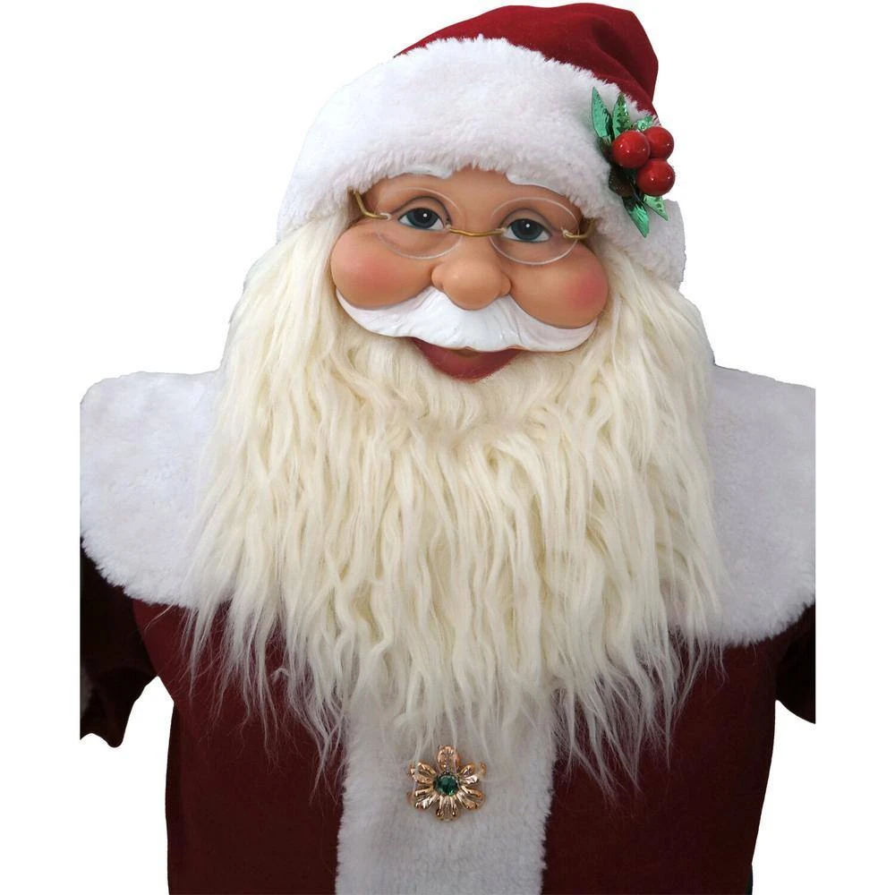 - FESTIVE OUTFIT: St. nick is festively dressed in a red velvet suit with fluffy white trim and matching cap, a black belt with a large buckle completes his outfit