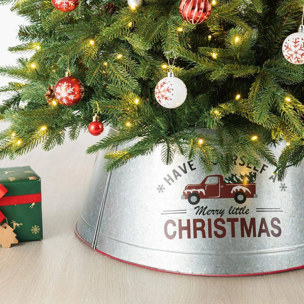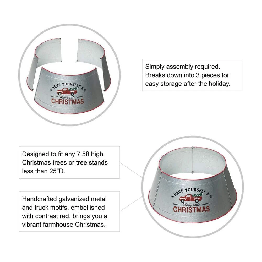 Add the final touch to your farmhouse Christmas with this galvanized metal tree collar. It slightly flares out toward the base, which creates simple framing and covers the trees stand. Made from sturdy metal, you can use this collar for seasons to come.
