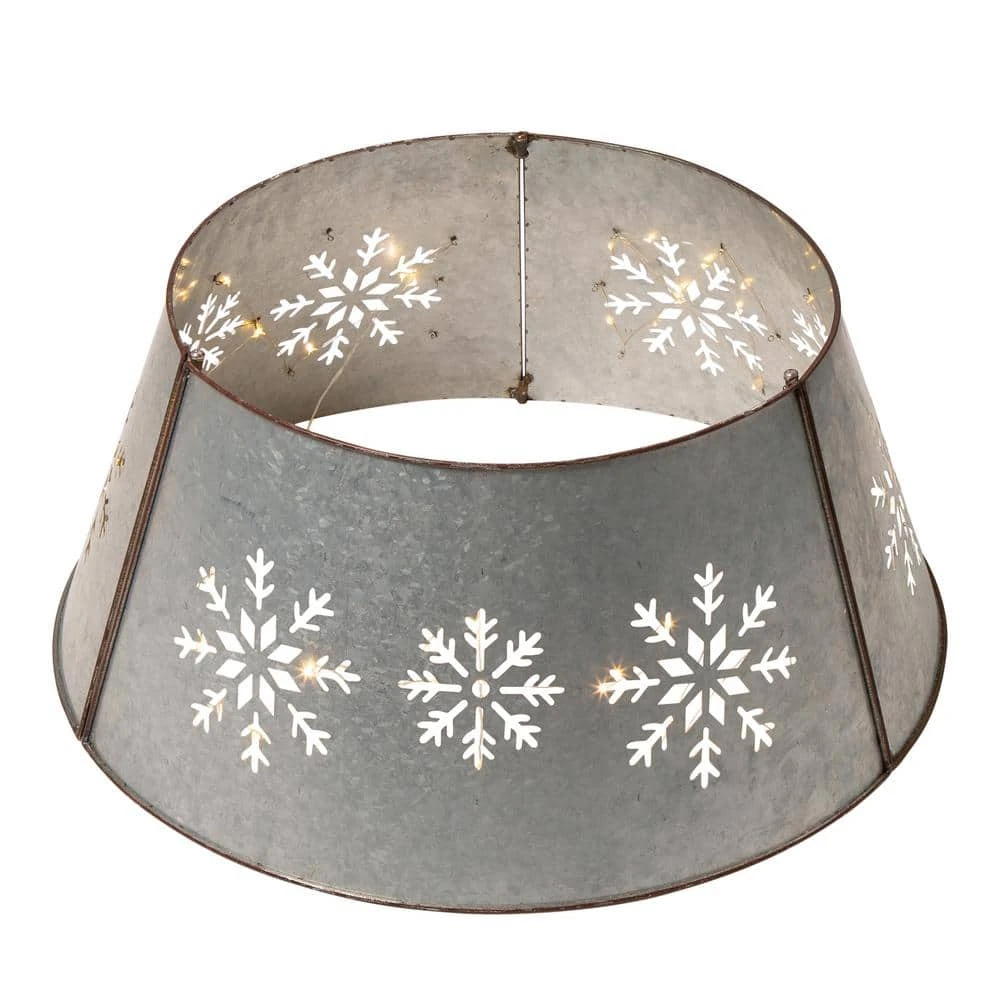 Add the final touch to your country Christmas with galvanized snowflake tree collar with lights string. It slightly flares out toward the base, which creates simple framing and covers the tree’s stand. Create a unique look for your Christmas tree this year with this Rustic Tree Collar. This unique collar gives the tree a rustic look while maintaining the holiday spirit.