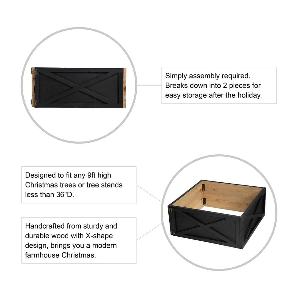 Our handcrafted tree box collars add a rustic, elegant charm to any home or business. The tree boxes not only add beauty and hide the undesirable parts of your tree, but they also prevent kids and pets from getting into the bottom side of your tree. They are stained in black finish.