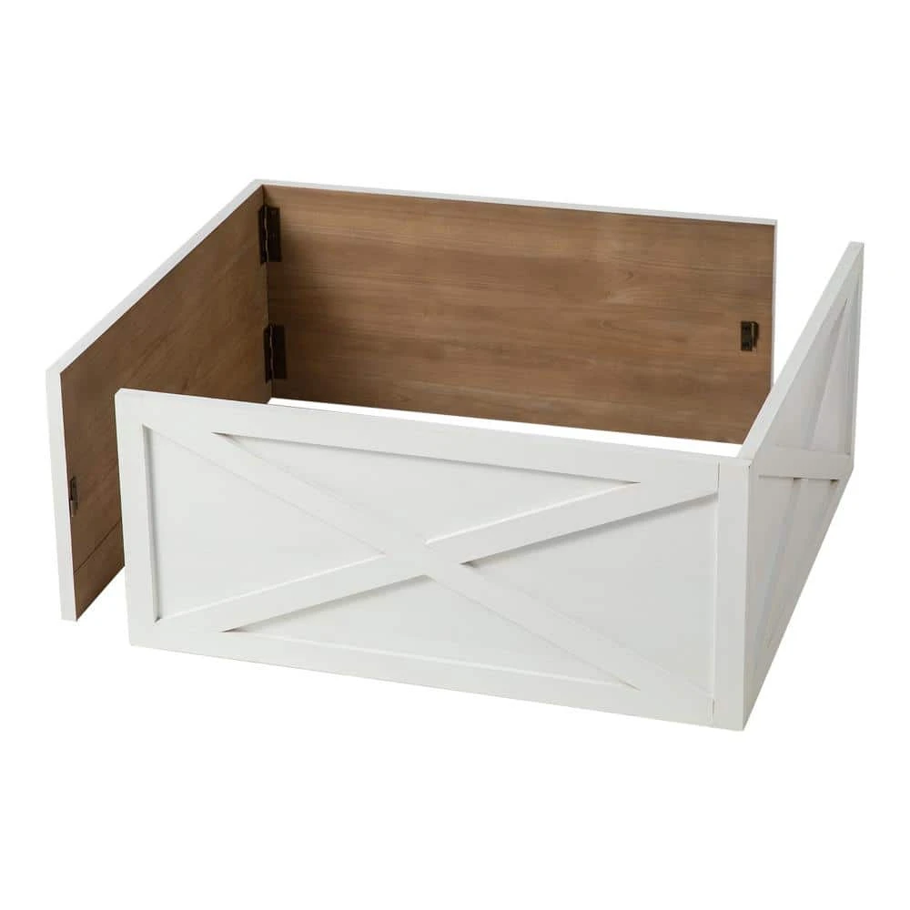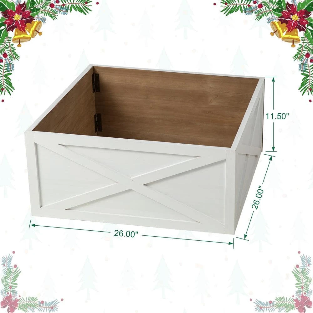 It’s handcrafted from sturdy and durable solid wood, featuring X-shape design in wash white finish, brings you a modern farmhouse Christmas. Made for 9 ft. high trees for variety of shapes or colors. Each 2 panels has been pre-assembled with hinges and other 2 panels features right-angle bolt for easy installation, ensuring convenience and neatness.