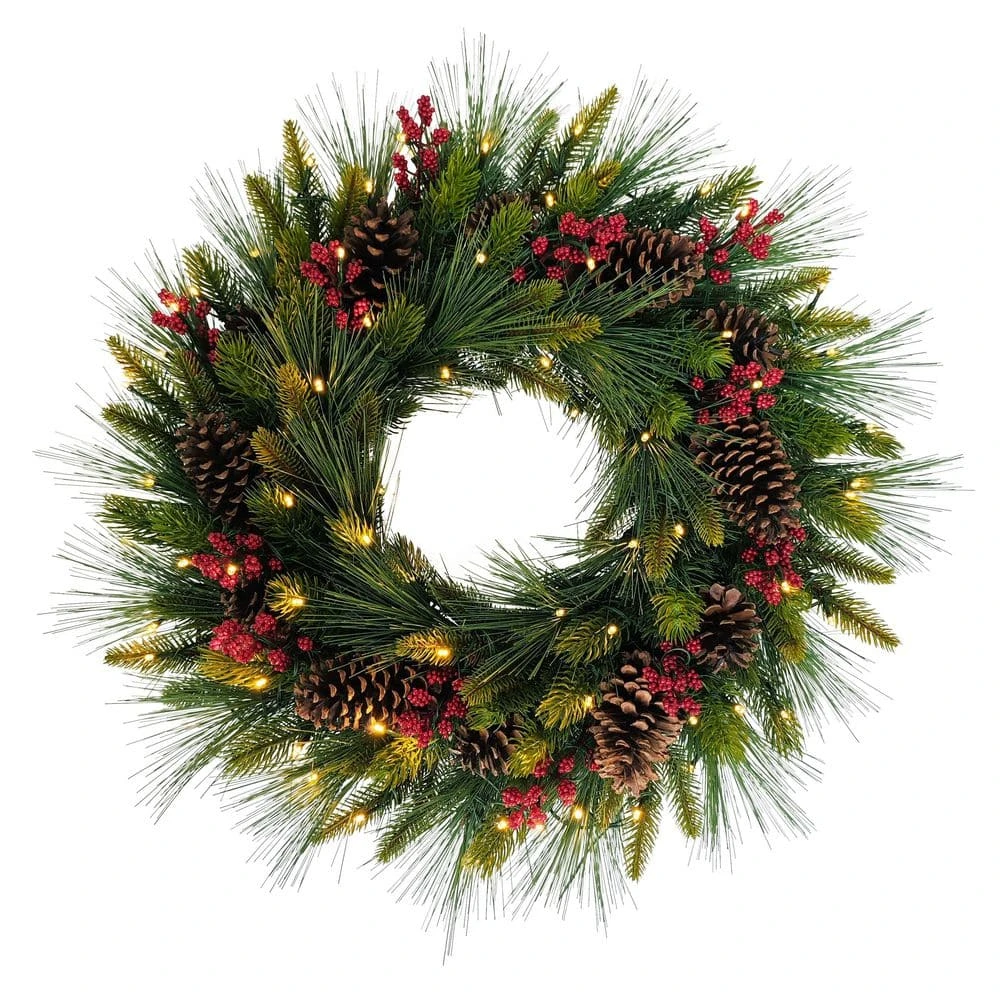 - 26 in. pre-lit battery-operated on/off timer Christmas wreath: comes with 80 LED warm white lights, providing a soft, inviting glow the lights are already integrated, so there is no need for extra installation and comes with an 8-16 hour on/off timer for your convenience please note: 3 d batteries are not included with the Puleo International 26 in. pre-lit artificial adorned Christmas wreath