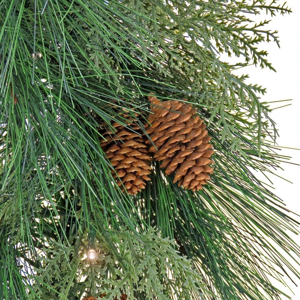This wreath features a mixture of cedar and bristle branch tips flowing from a woven branch ring base. It is trimmed with pinecones that add complementing color and natural appeal. It is pre-strung with 50 battery-operated warm white LED lights that are energy-efficient and long lasting. 6 hours ON/18 hours OFF timed operation. This wreath can be displayed on door, wall, or window in indoor or covered outdoor locations.
